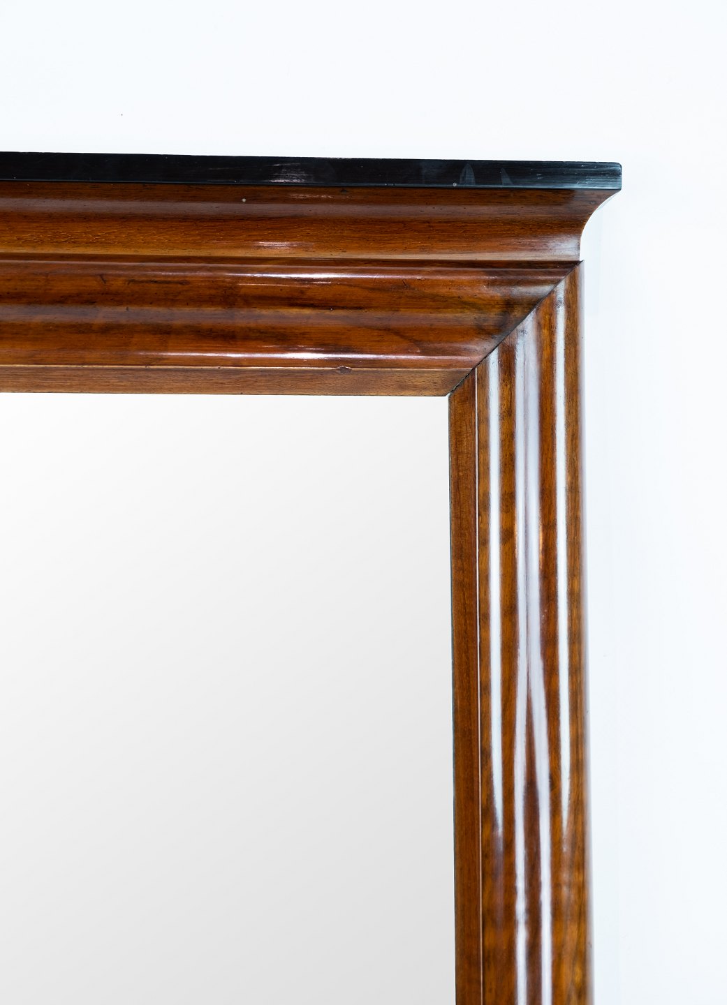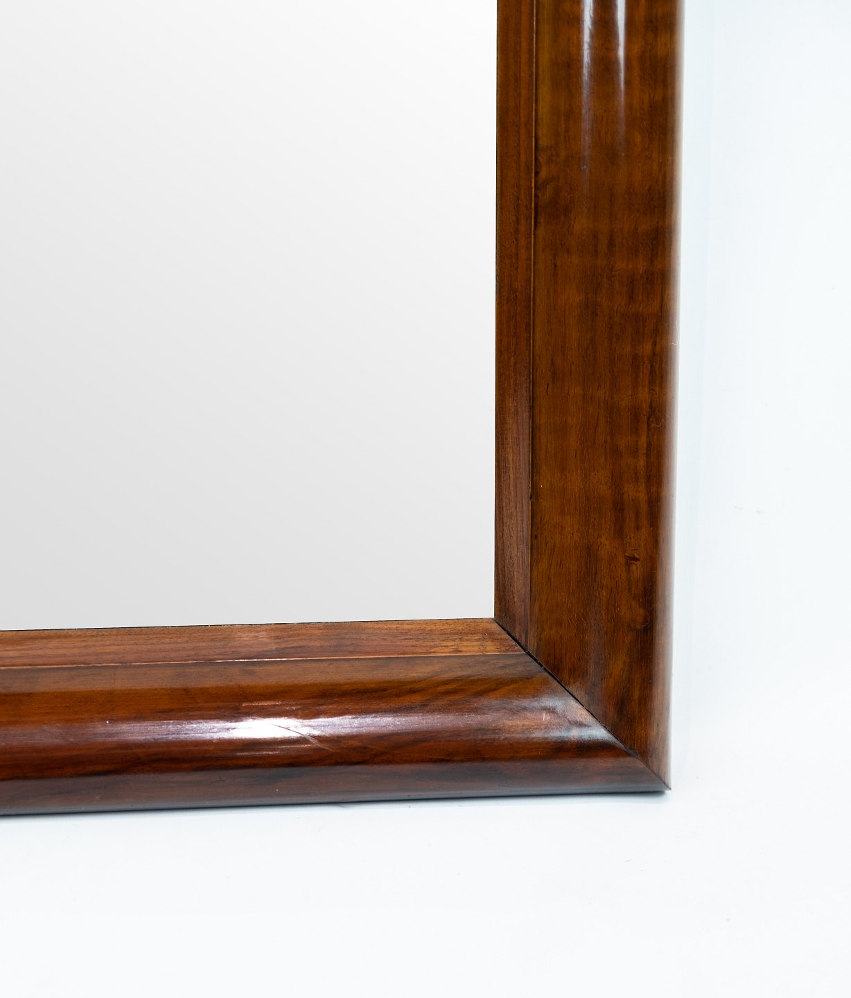 SolgtHøjt spejl med ramme af poleret mahogni, i flot brugt stand.