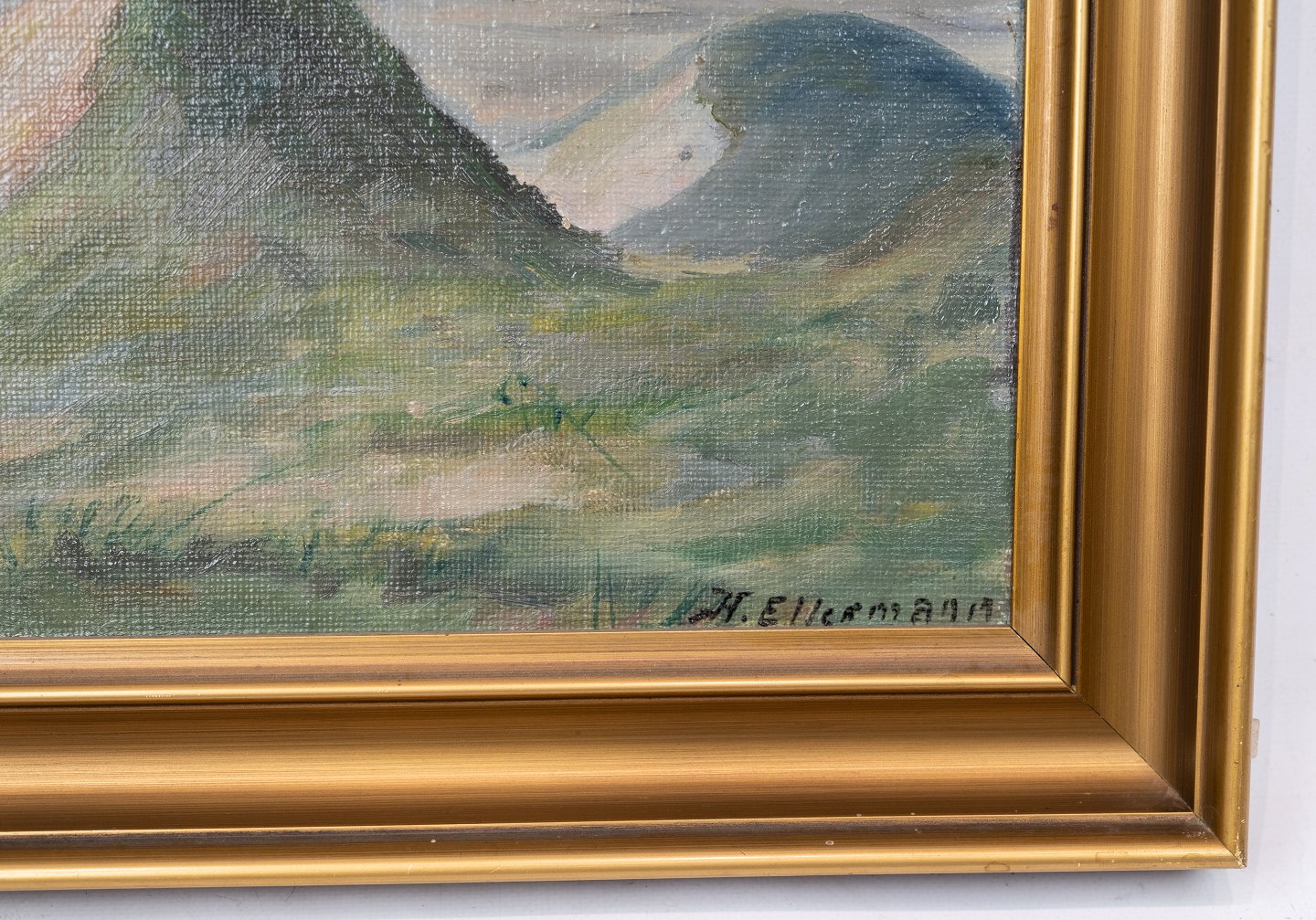 SolgtOliemaleri med motiv af solnedgang signeret H. Ellemann og med forgyldt ramme.