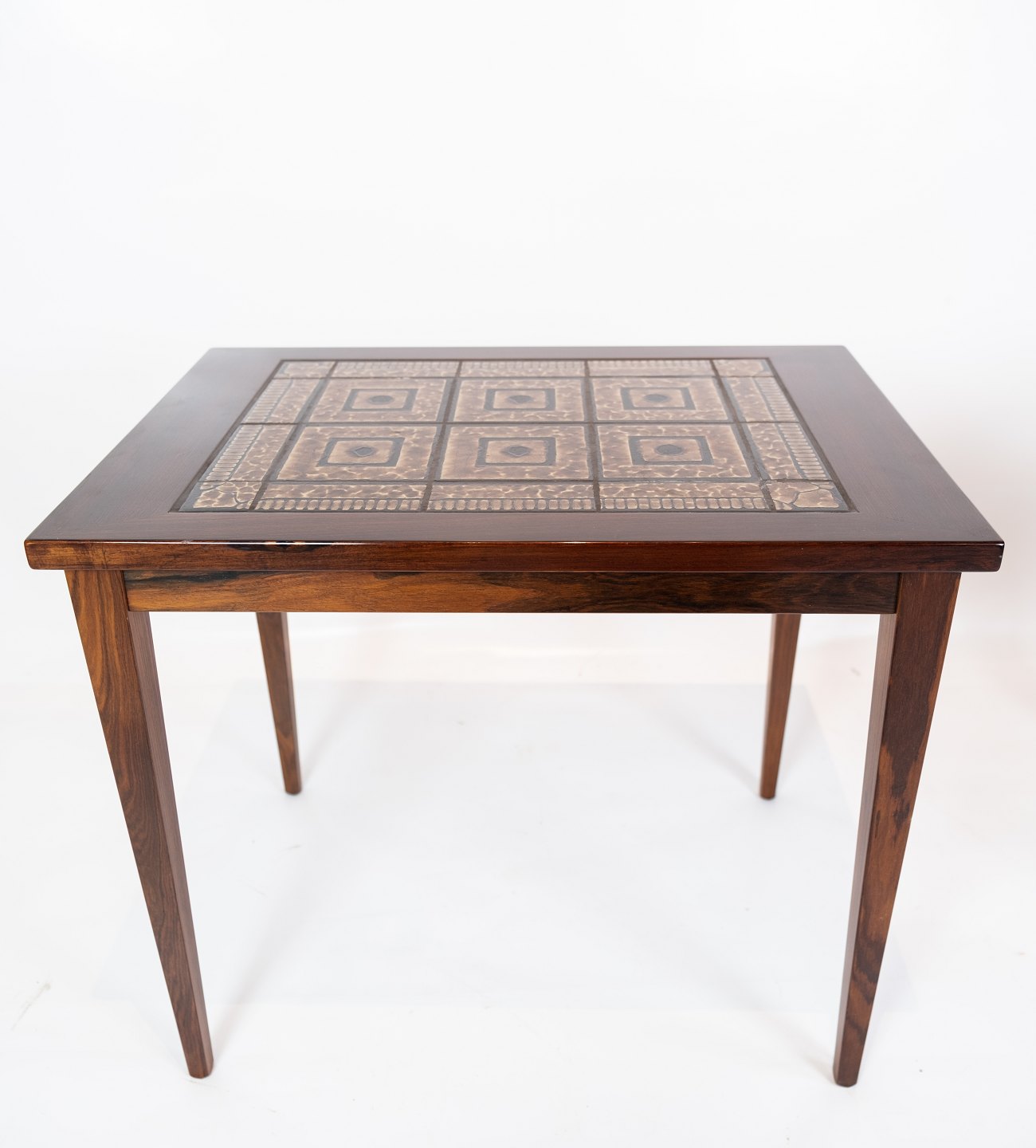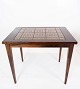 Et sæt sengeborde i mahogni med brune klinker, af dansk design fra 1960erne. Bordene er i flot brugt stand.