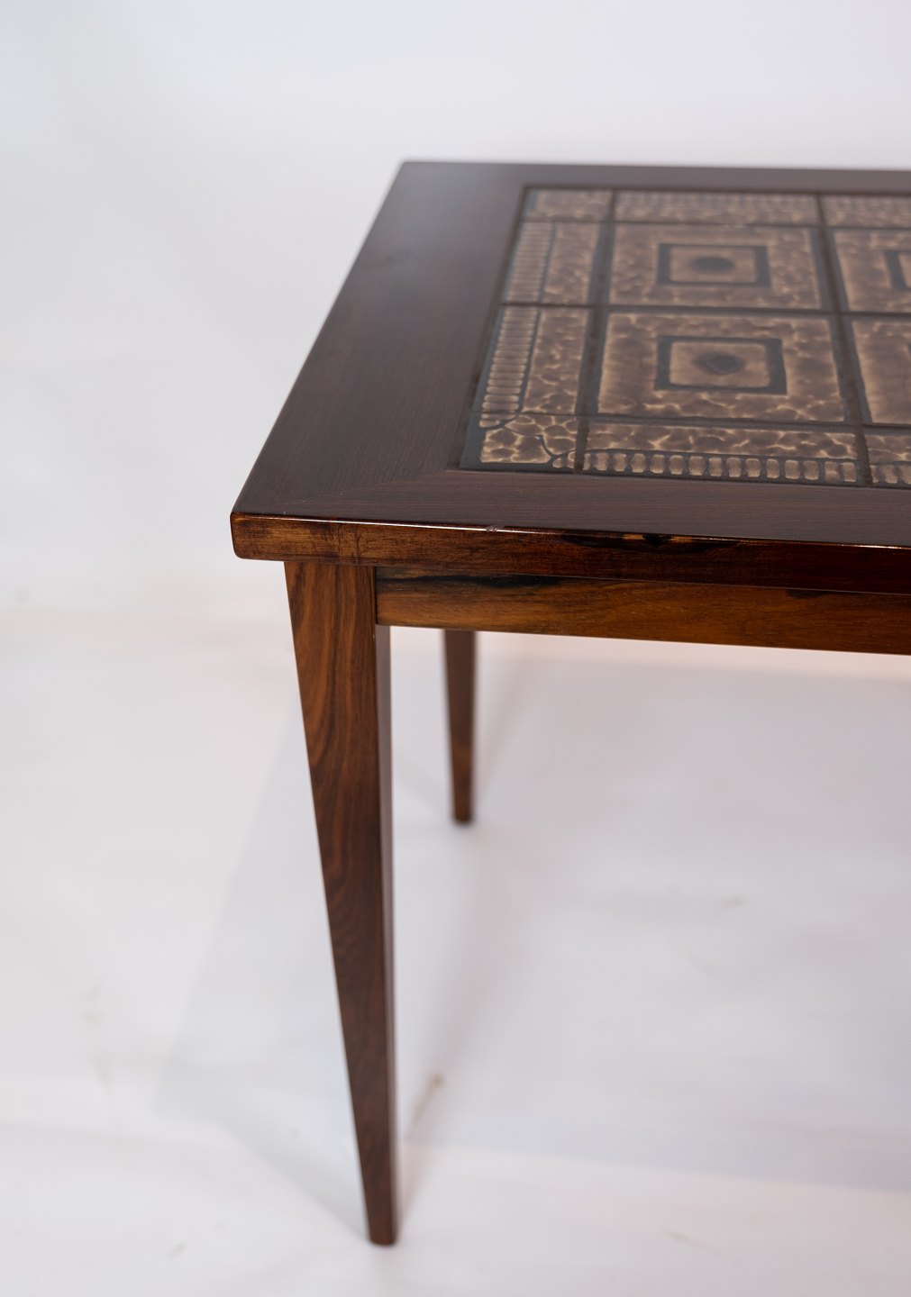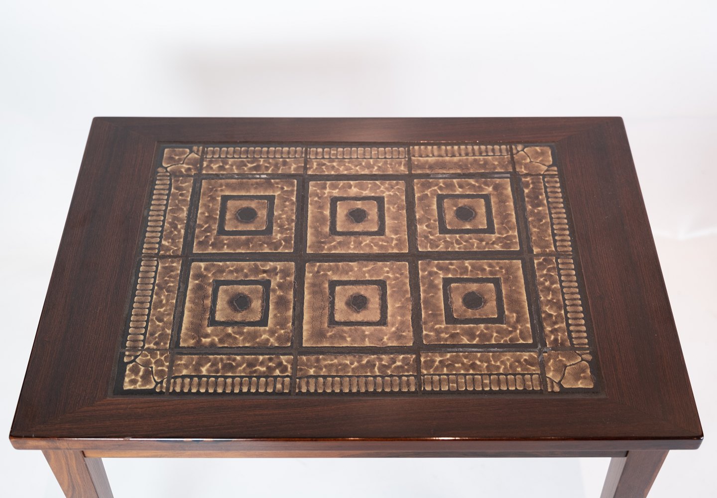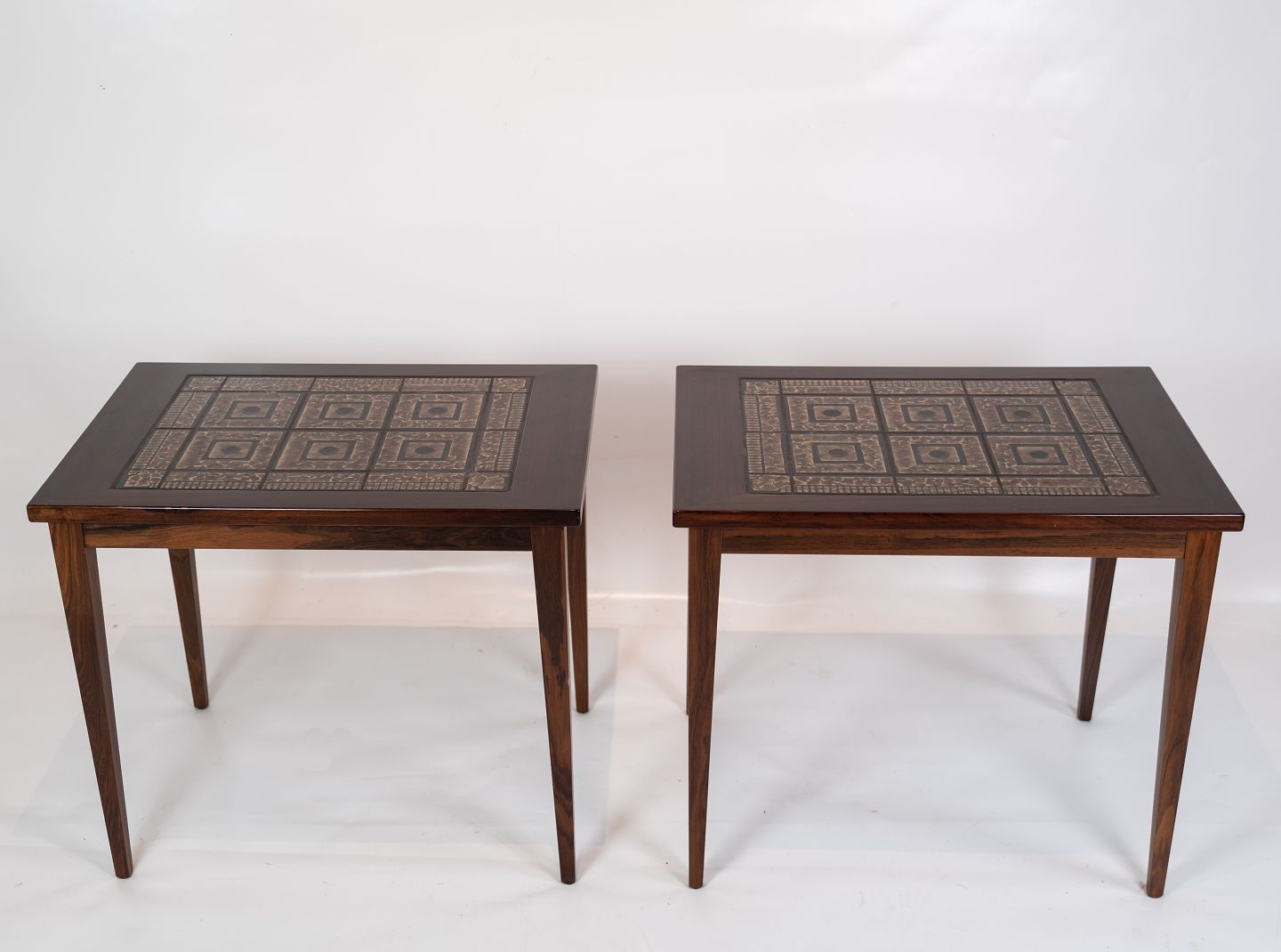 Et sæt sengeborde i mahogni med brune klinker, af dansk design fra 1960erne.