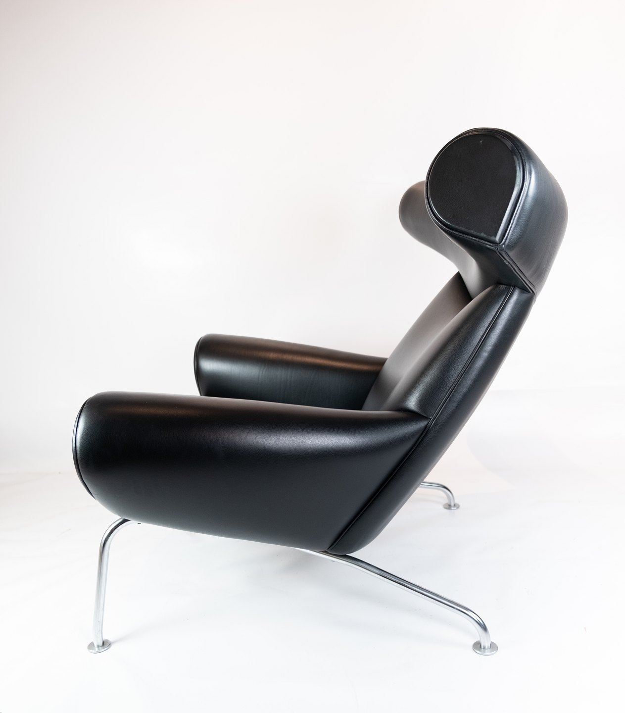 SolgtOx chair, model EJ 100 polstret i sort læder, designet af Hans J. Wegner i 1960erne og fremstillet hos Erik Jørgensen Møbelfabrik. Stolen er i flot brugt stand.