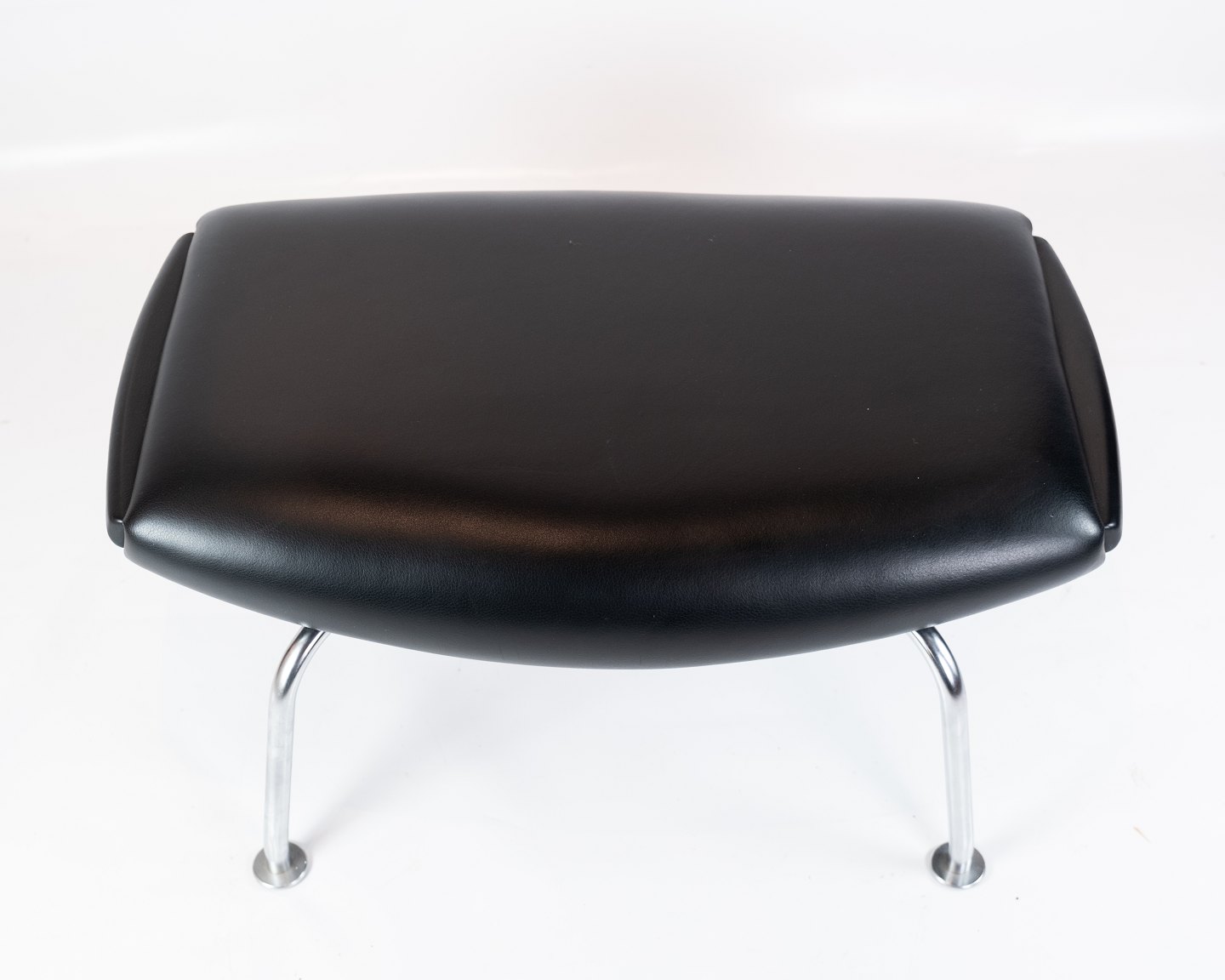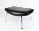 SolgtSkammel til Ox chair, model EJ 100-F, polstret i sort læder, designet af Hans J. Wegner i 1960erne og fremstillet hos Erik Jørgensen Møbelfabrik.