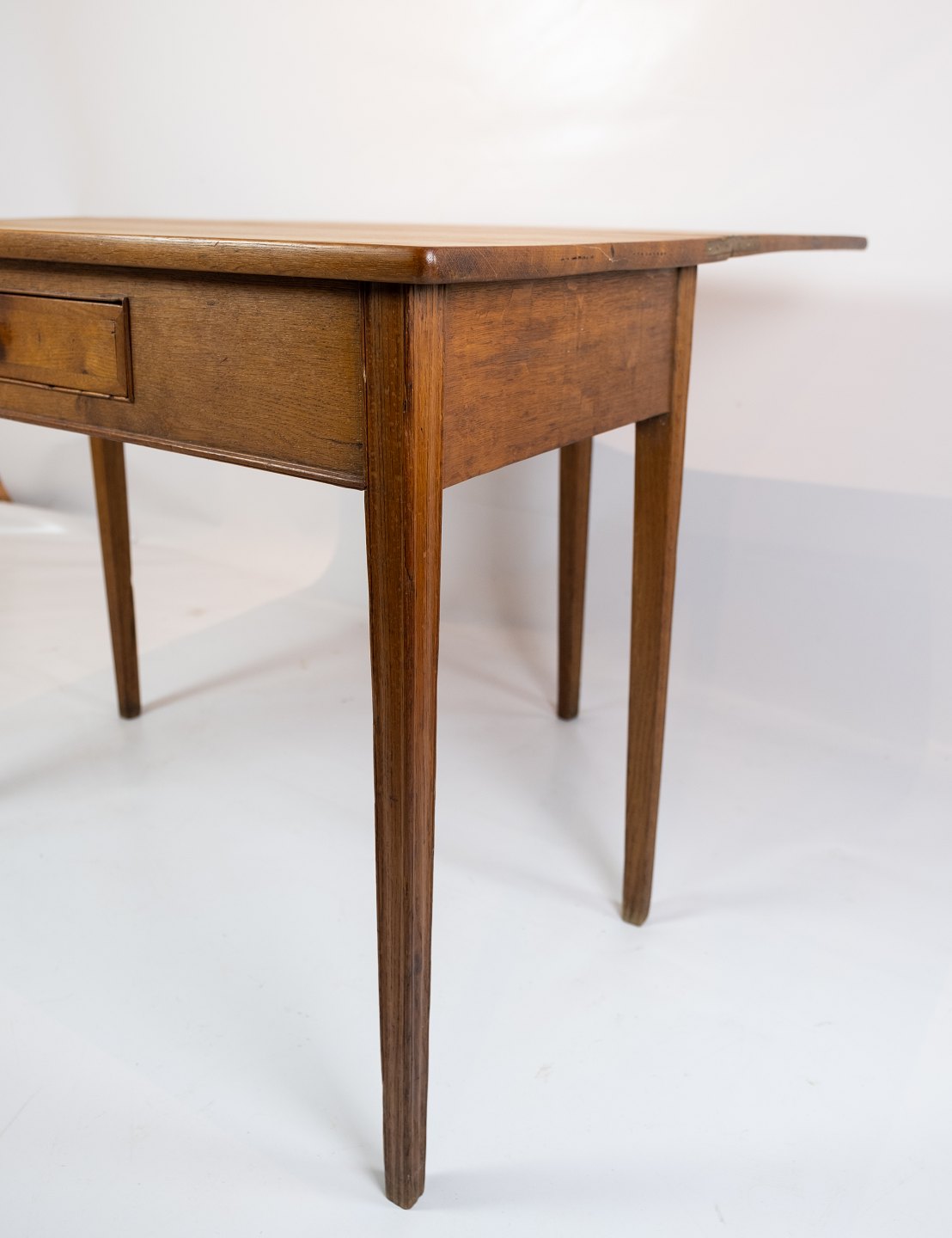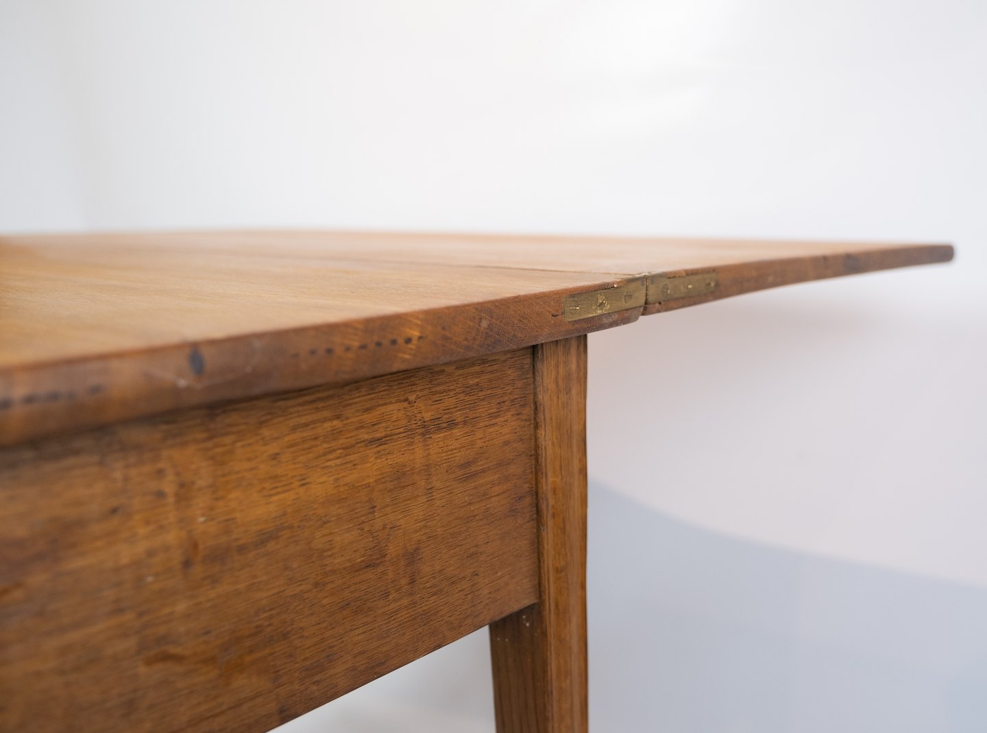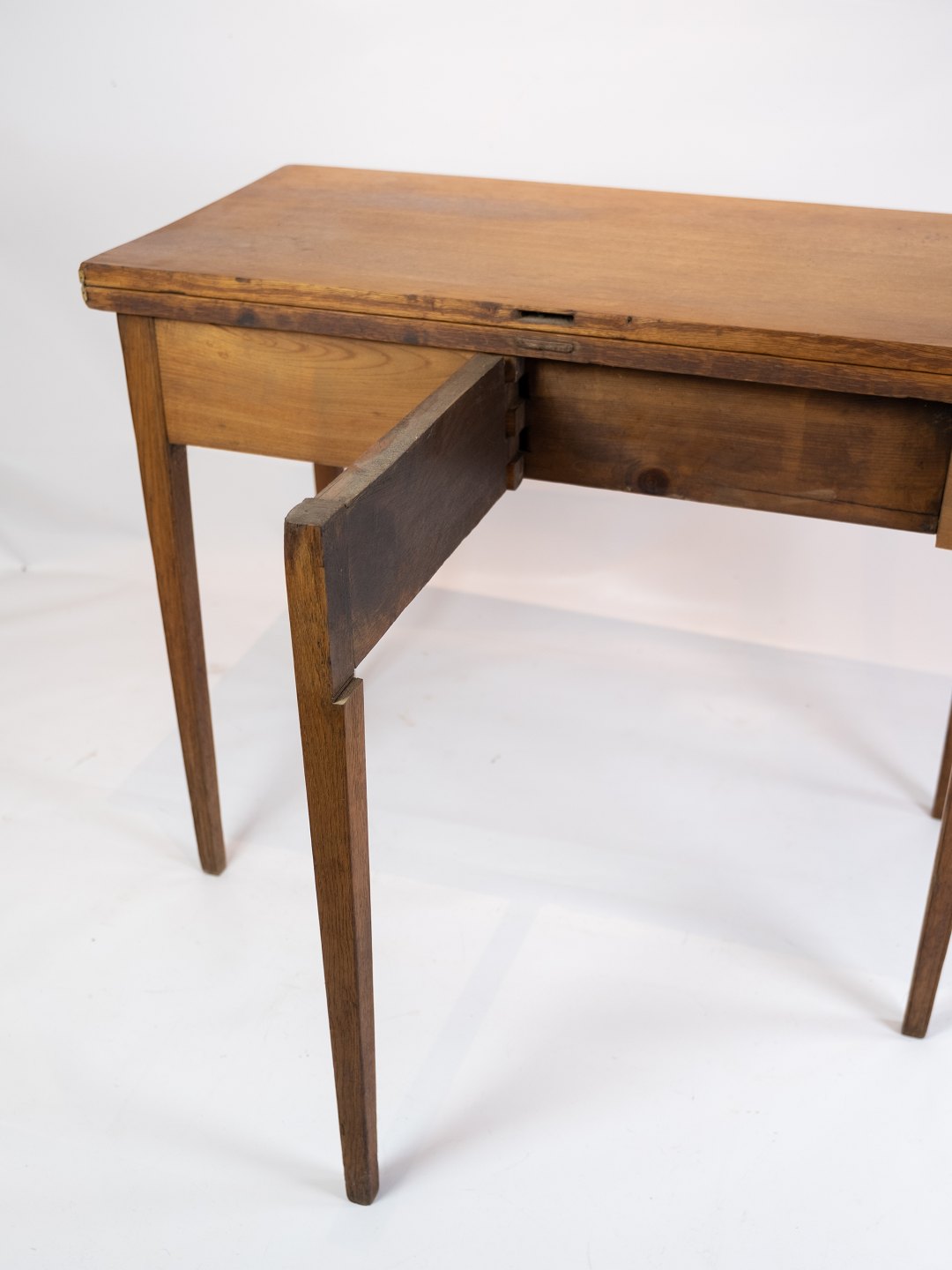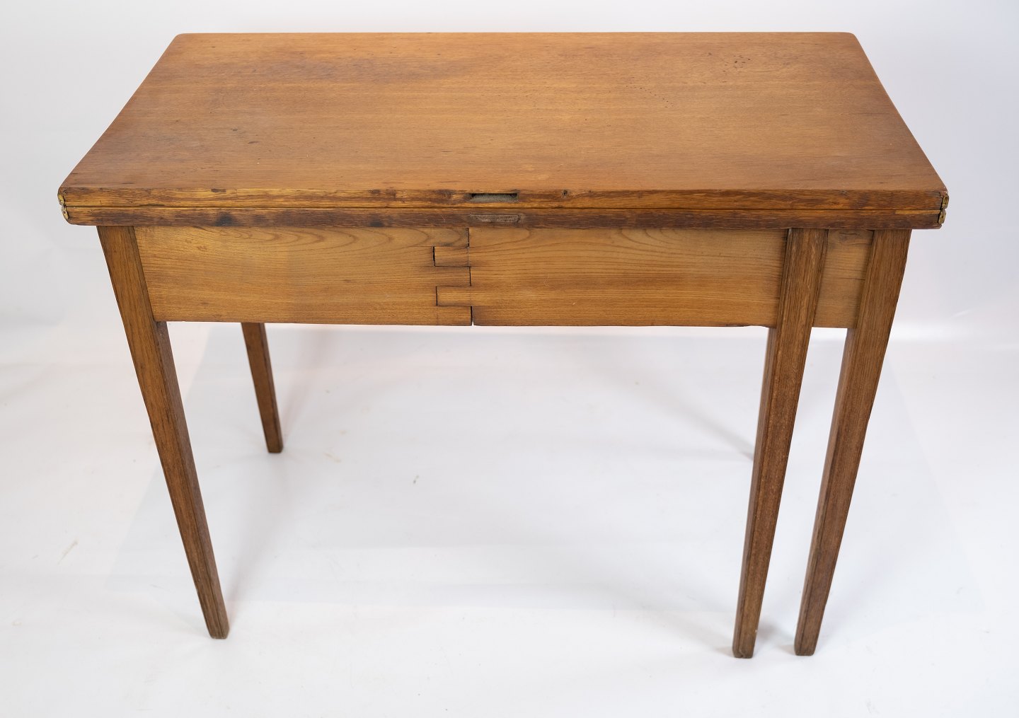 SolgtAntikt spillebord med mindre skuffe af eg fra 1830erne og dansk. Bordepladen kan foldes ud og er i flot brugt stand.