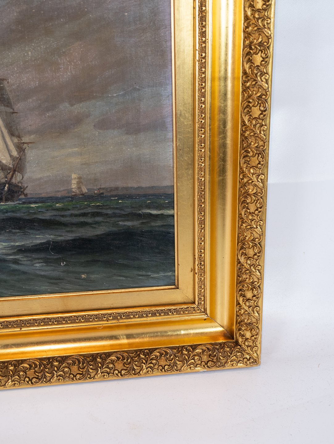 SoldOil painting with marine motif with gilded frame signed Carl Locher. The painting is in great vintage condition. Carl Locher was born in Flensburg in 1851 and died in Skagen in 1915.