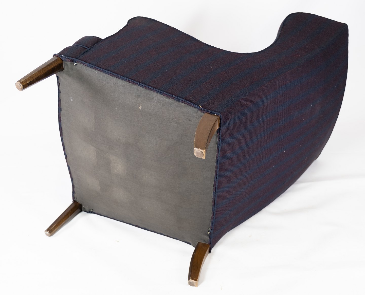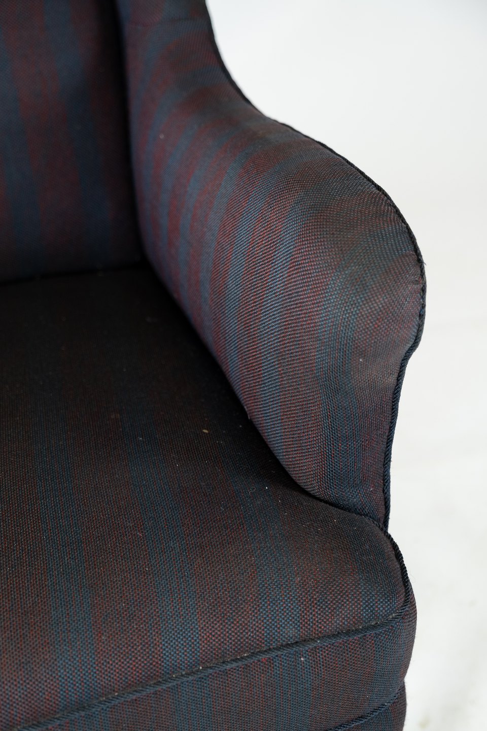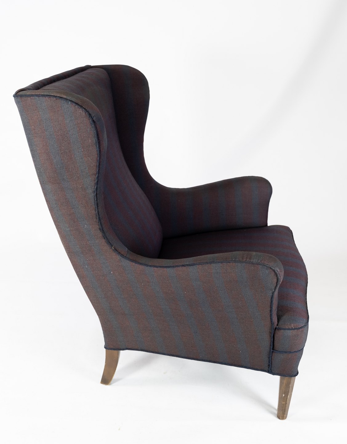 Høj lænestol med mørkt stribet stof, i flot brugt stand fra 1940erne.