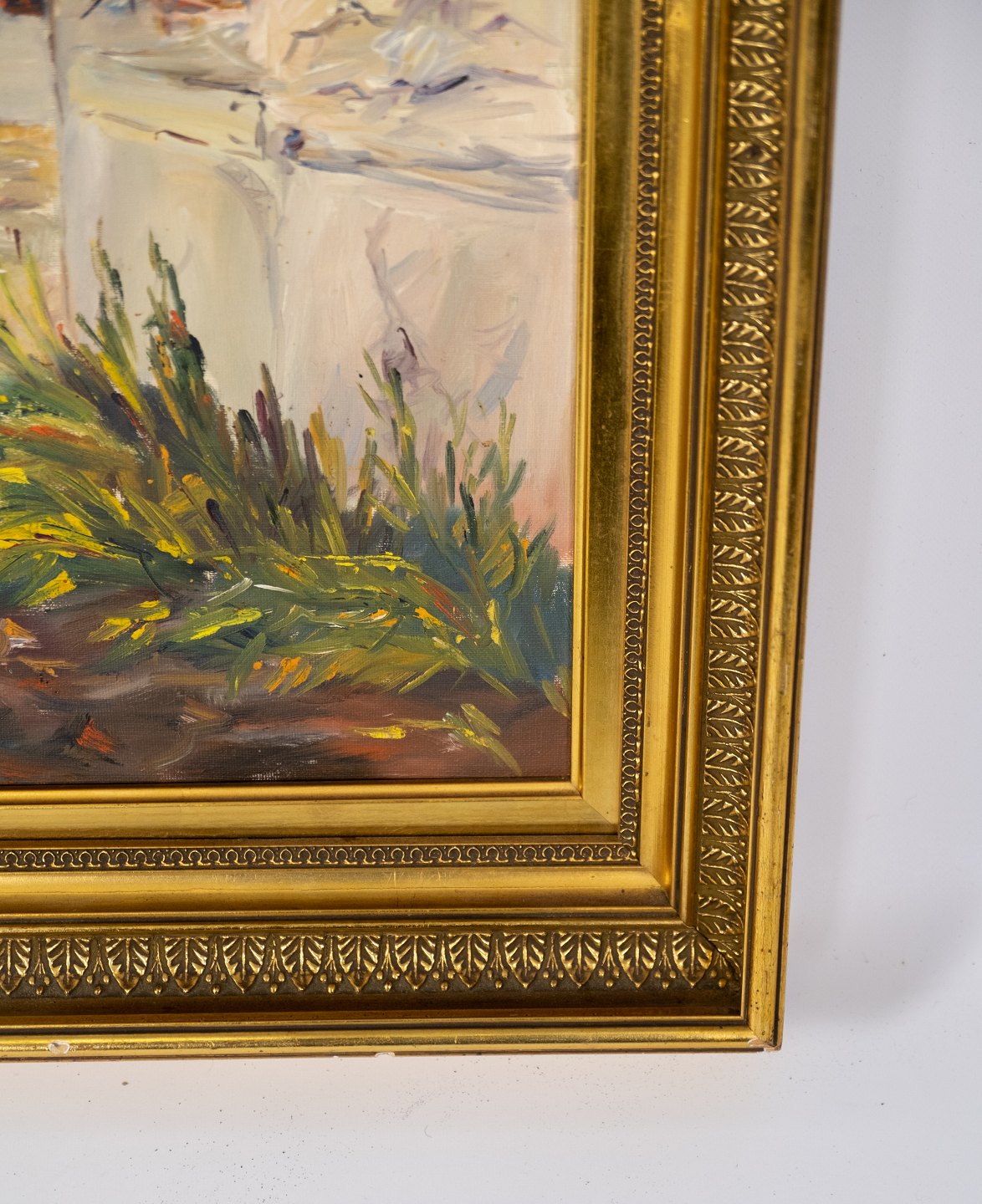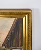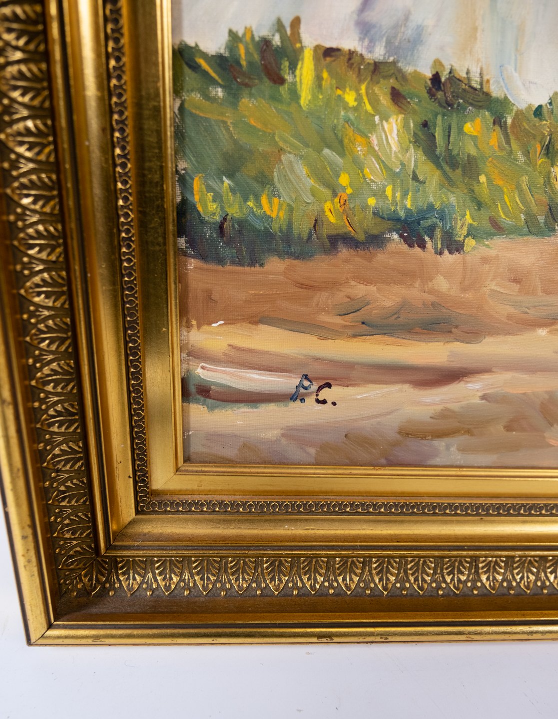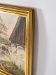 Oil painting with country motif and gilded frame, signed P.C. The painting is in great vintage condition.