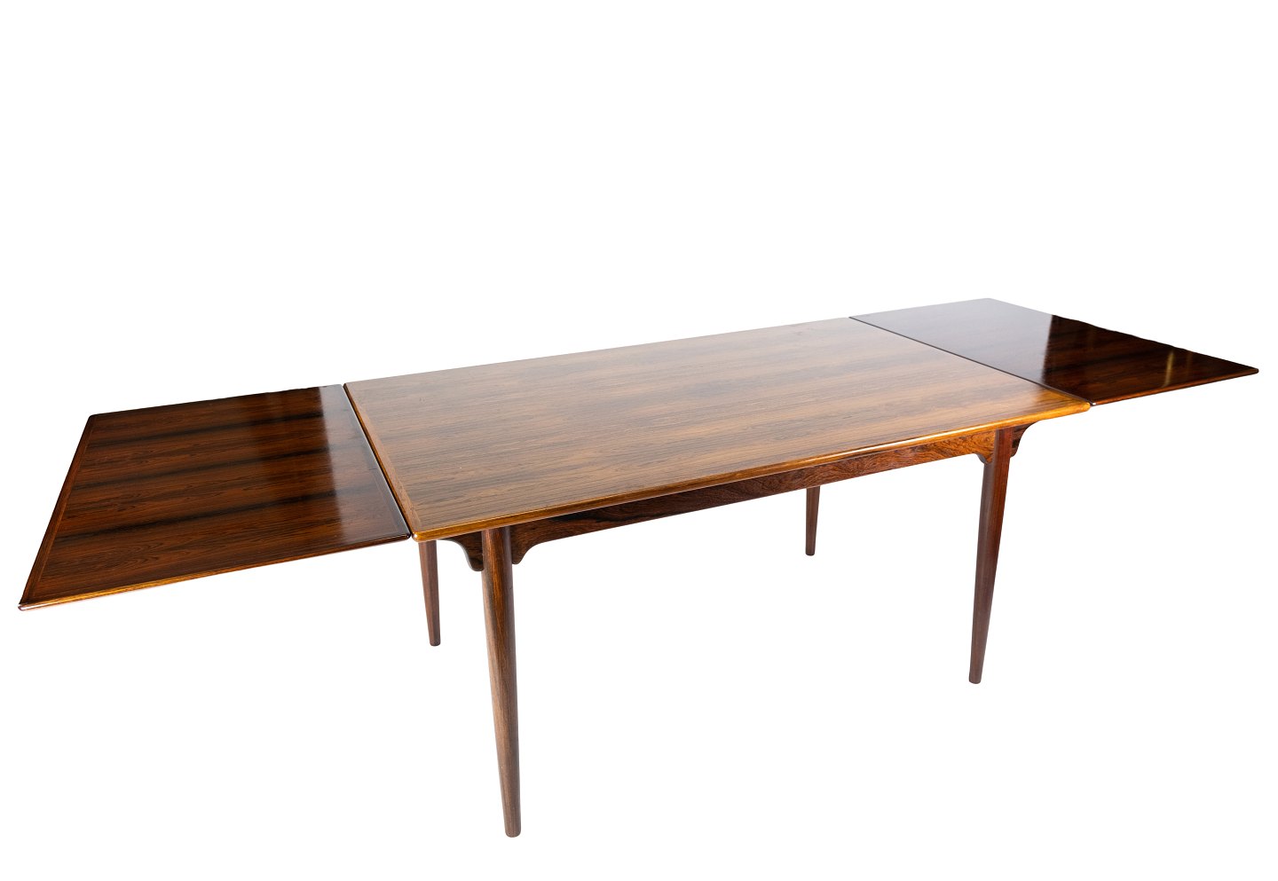 This rosewood dining table, designed by Arne Vodder in the 1960s, is a beautiful example of Danish furniture art from the mid-20th century. The rosewood gives the table a warm and natural glow, while the Dutch pull-out adds practical functionality.