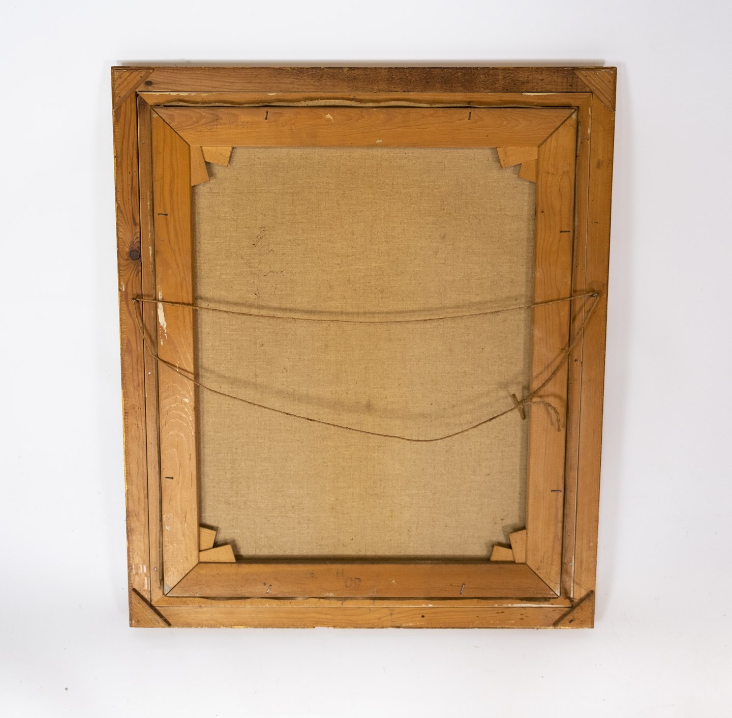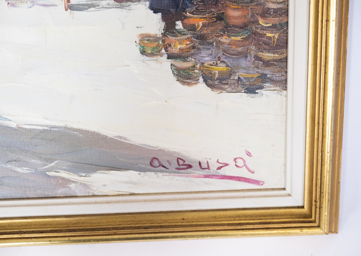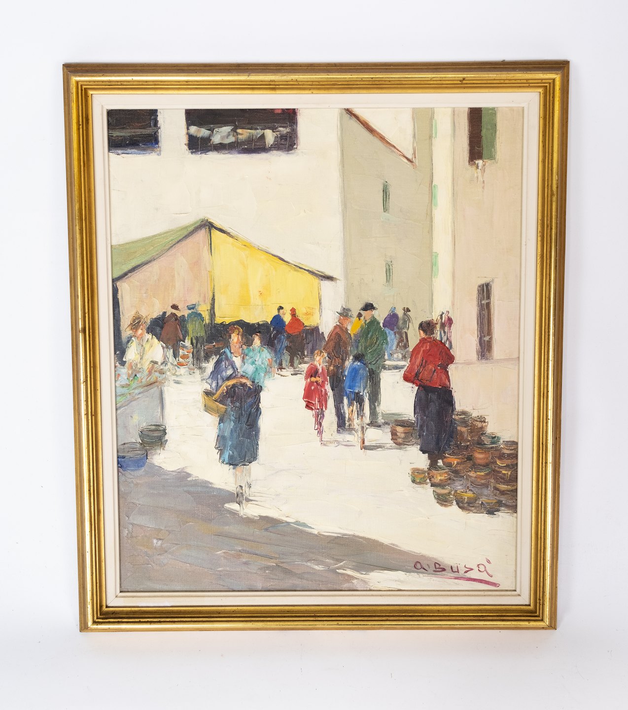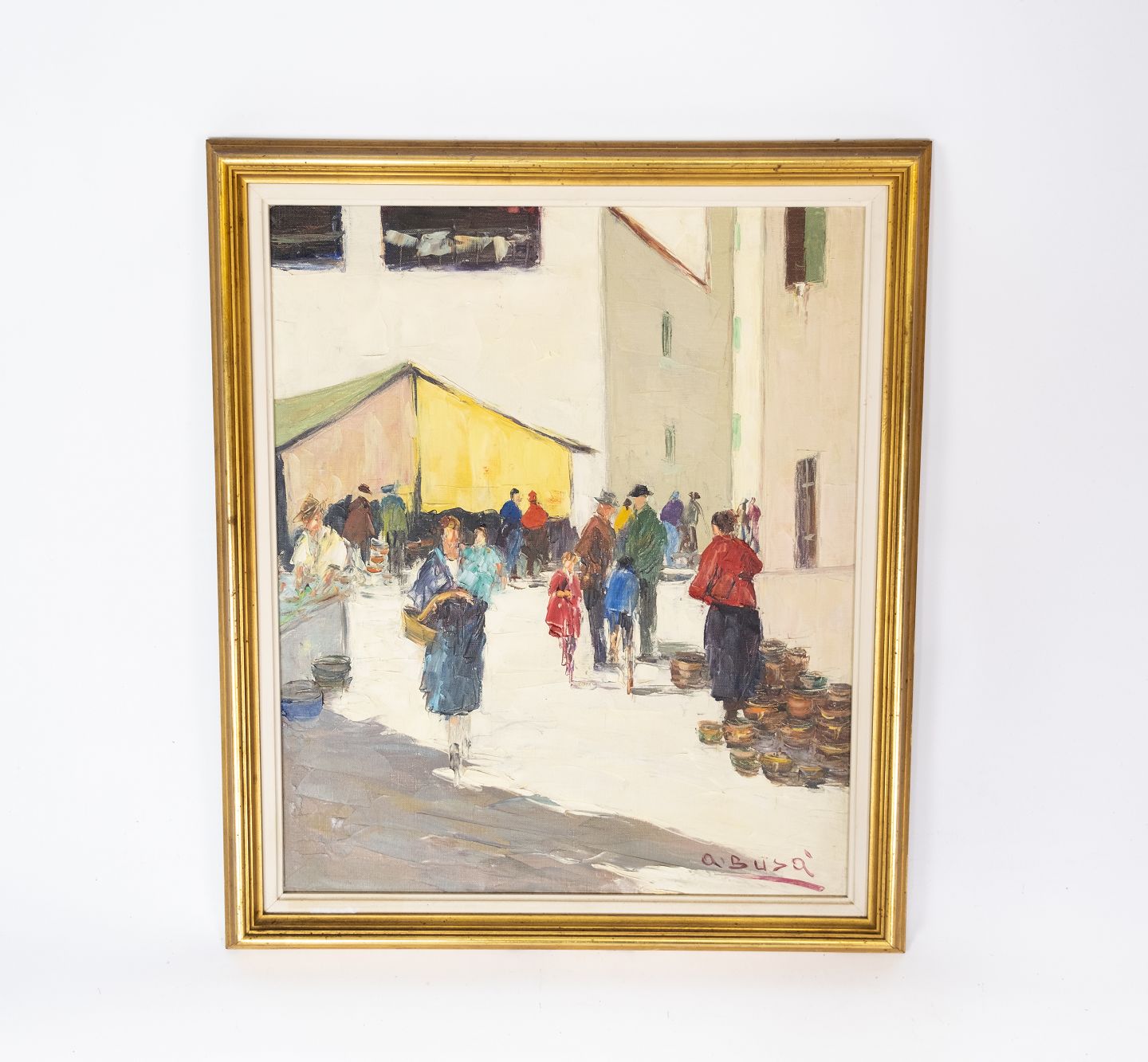 Oil painting with city motif and gilded frame, signed A. Suza from the 1940s.