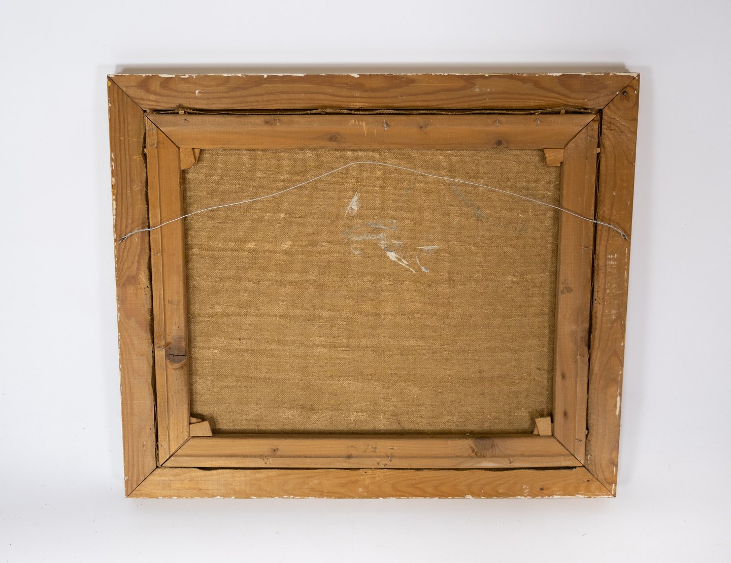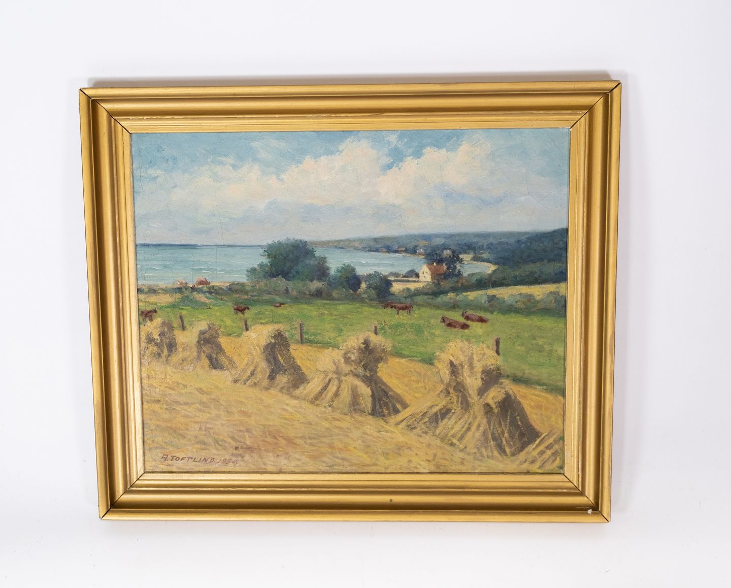 Oil painting with country motif and gilded frame, signed A. Toftlind 1950.