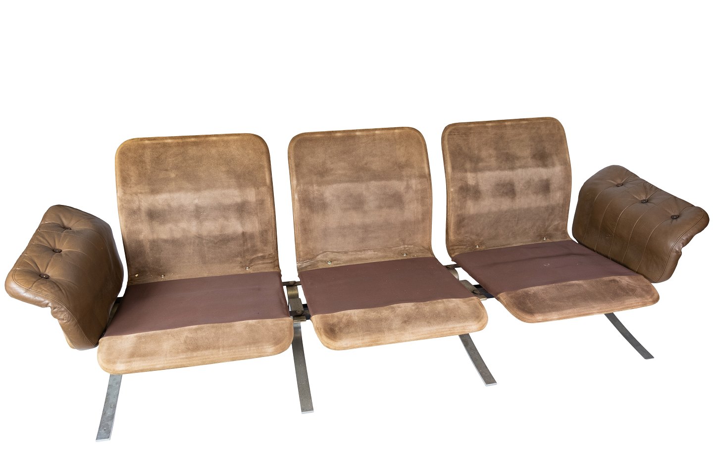 SoldThree seater sofa upholstered with light brown leather and frame in metal, of danish design from the 1970s. The sofa is in great vintage condition.