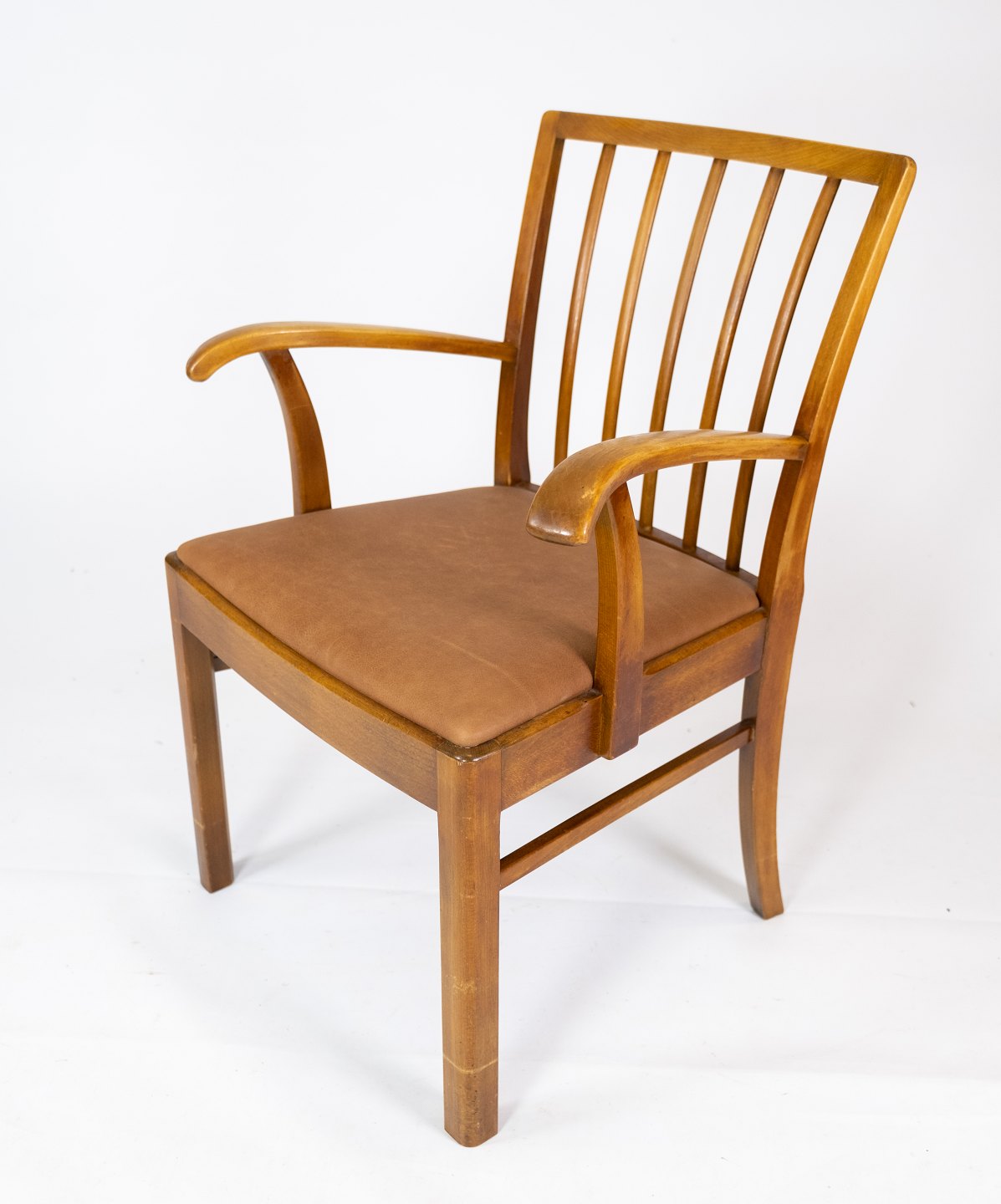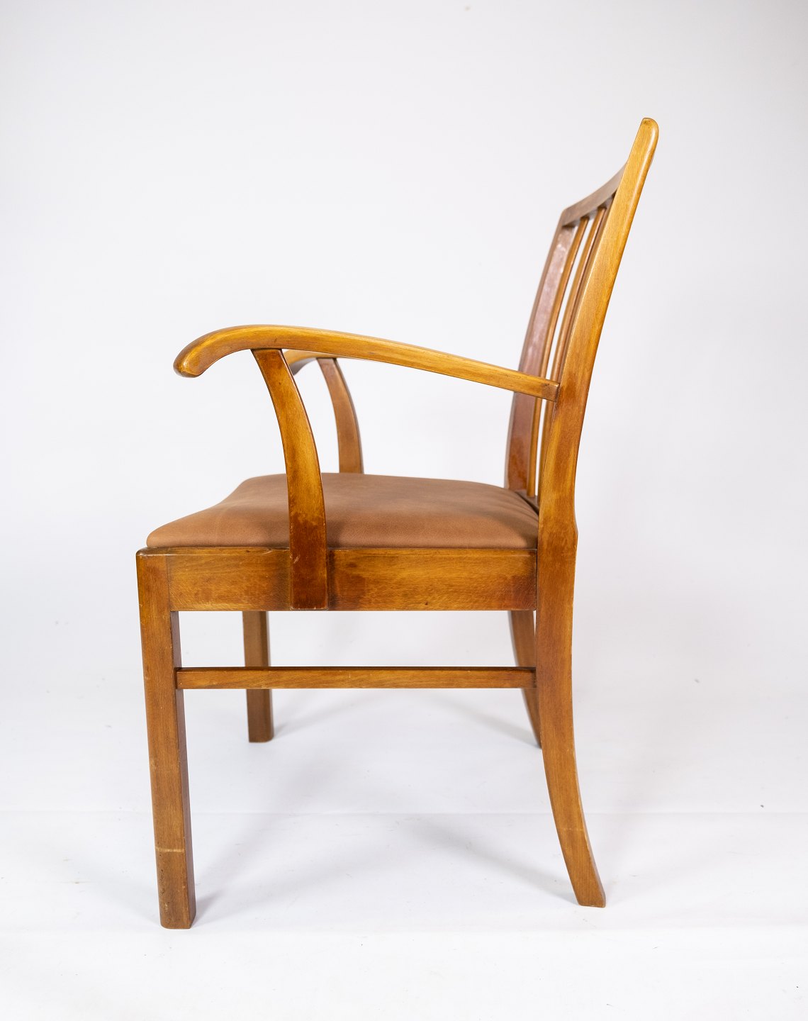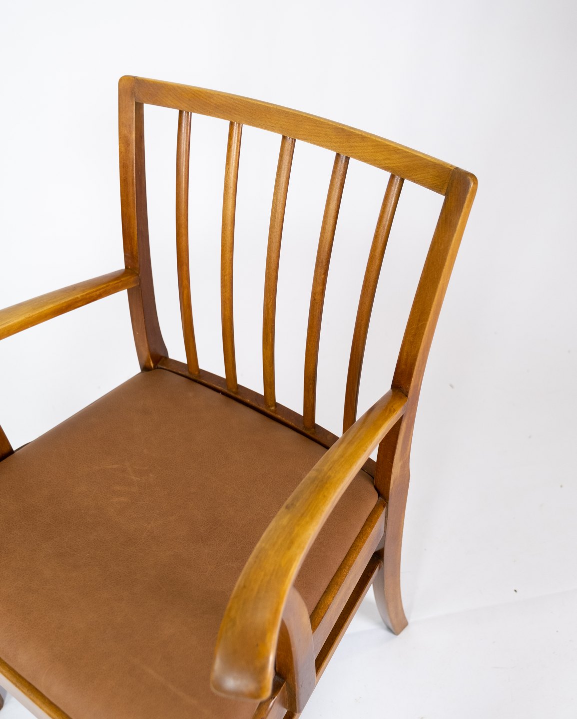 A set of two armchairs in light wood, upholstered with light brown leather, is a charming example of Danish craftsmanship from the 1940s. These chairs exude a classic elegance and simplicity that will add a warm and welcoming atmosphere to any room.