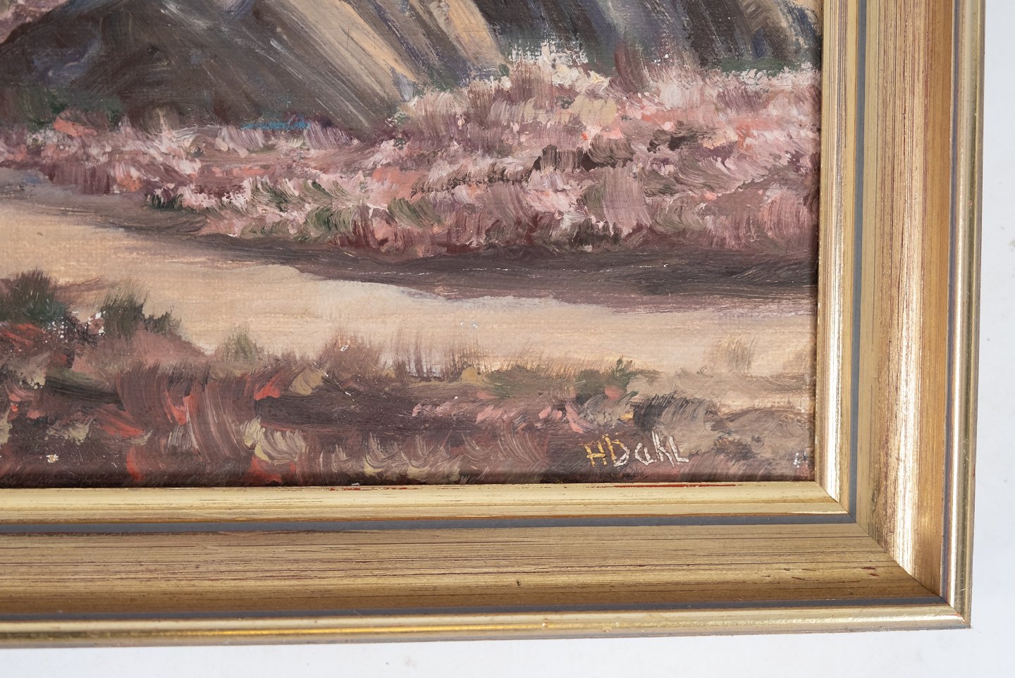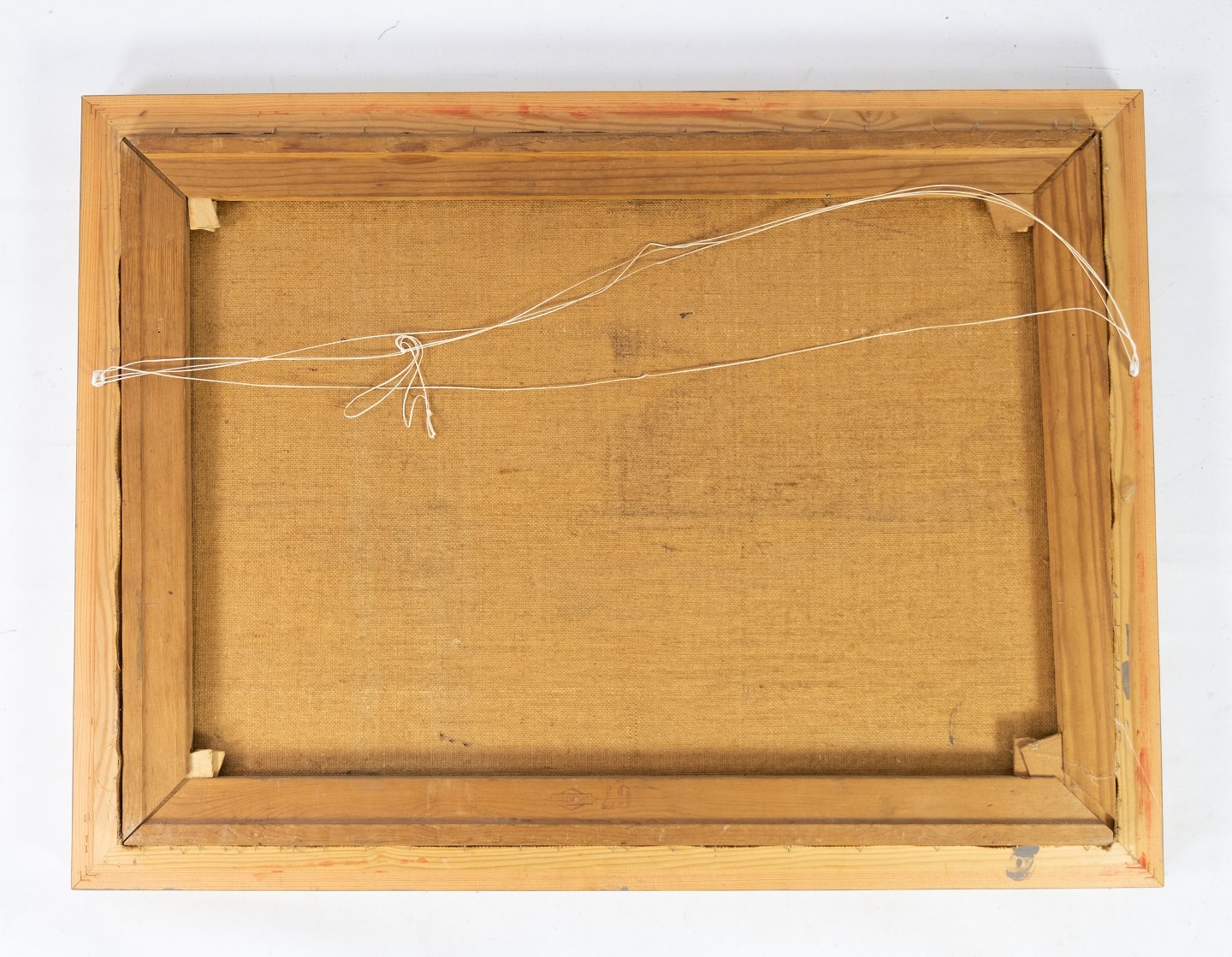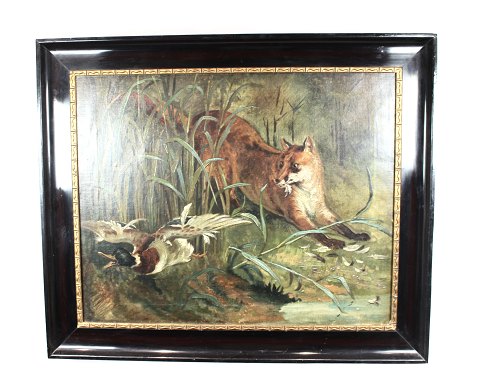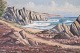 Oil painting with beach motif and gilded frame, with unknown signature from the 1930s.