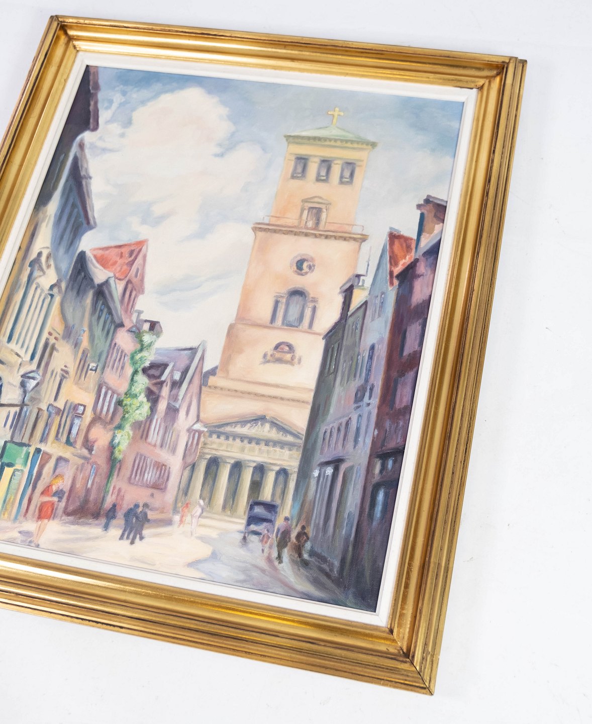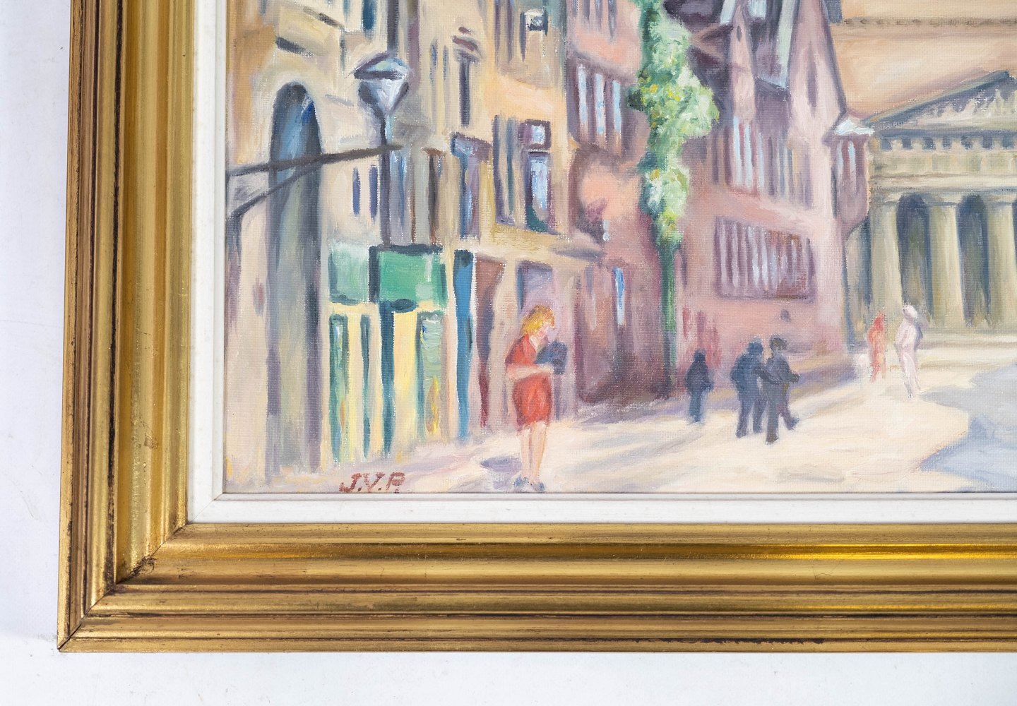 Oil painting with city motif and gilded frame, signed JVR from the 1940s.