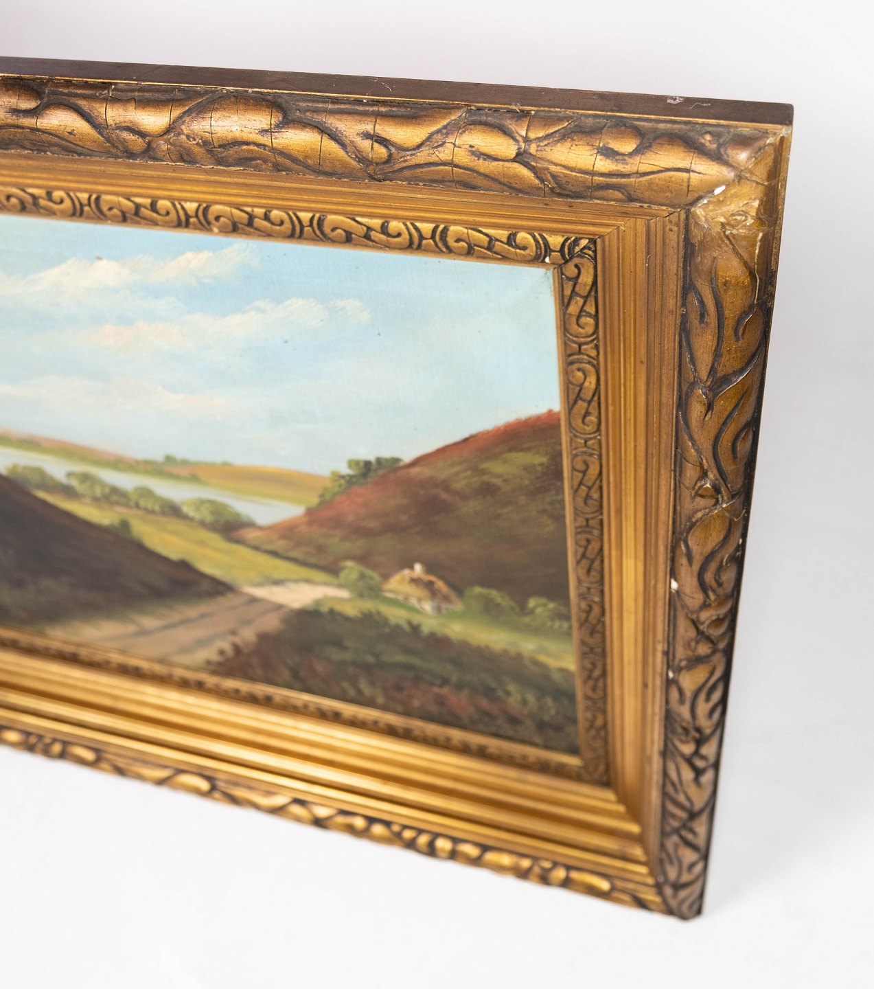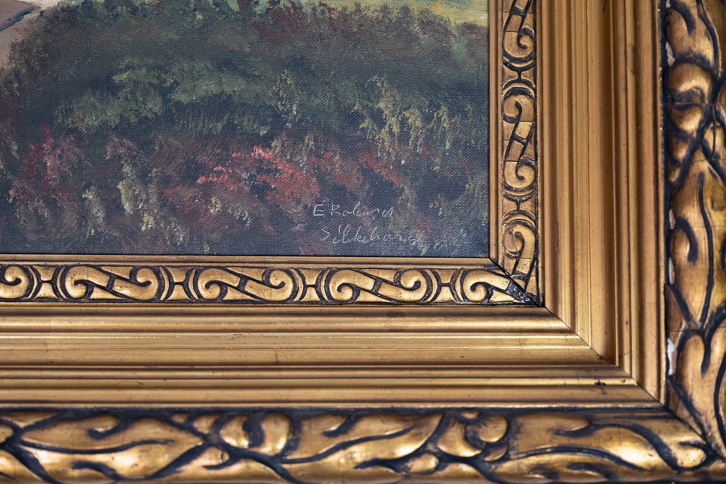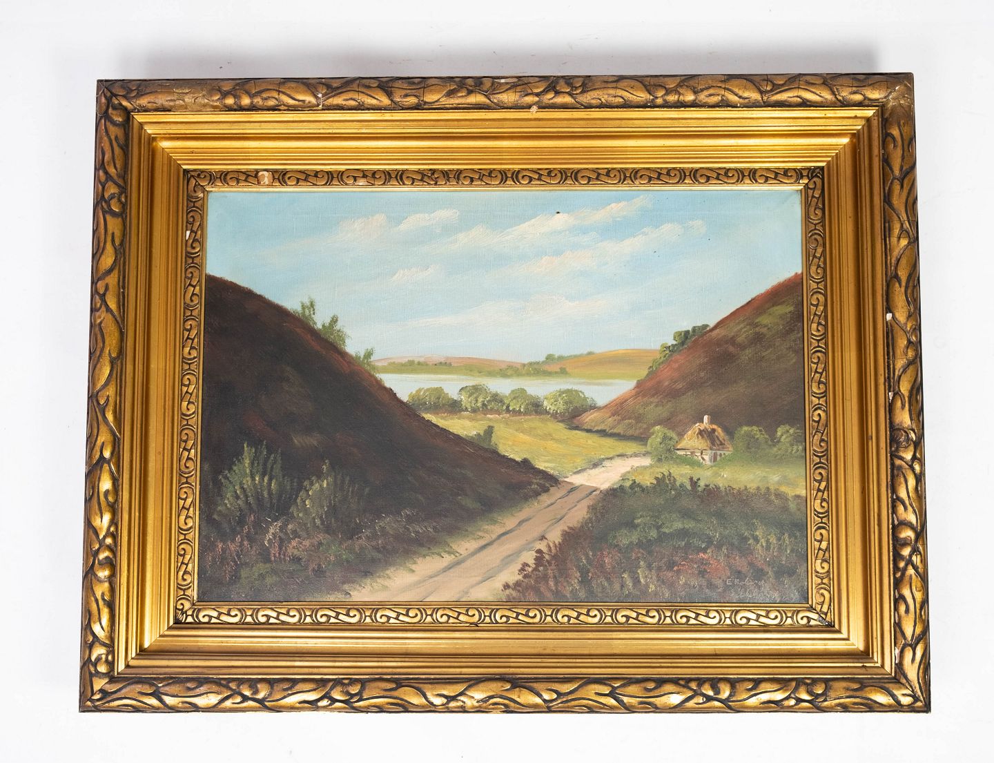 Oliemaleri med natur motiv og forgyldt ramme, ukendt signatur fra 1930erne.
