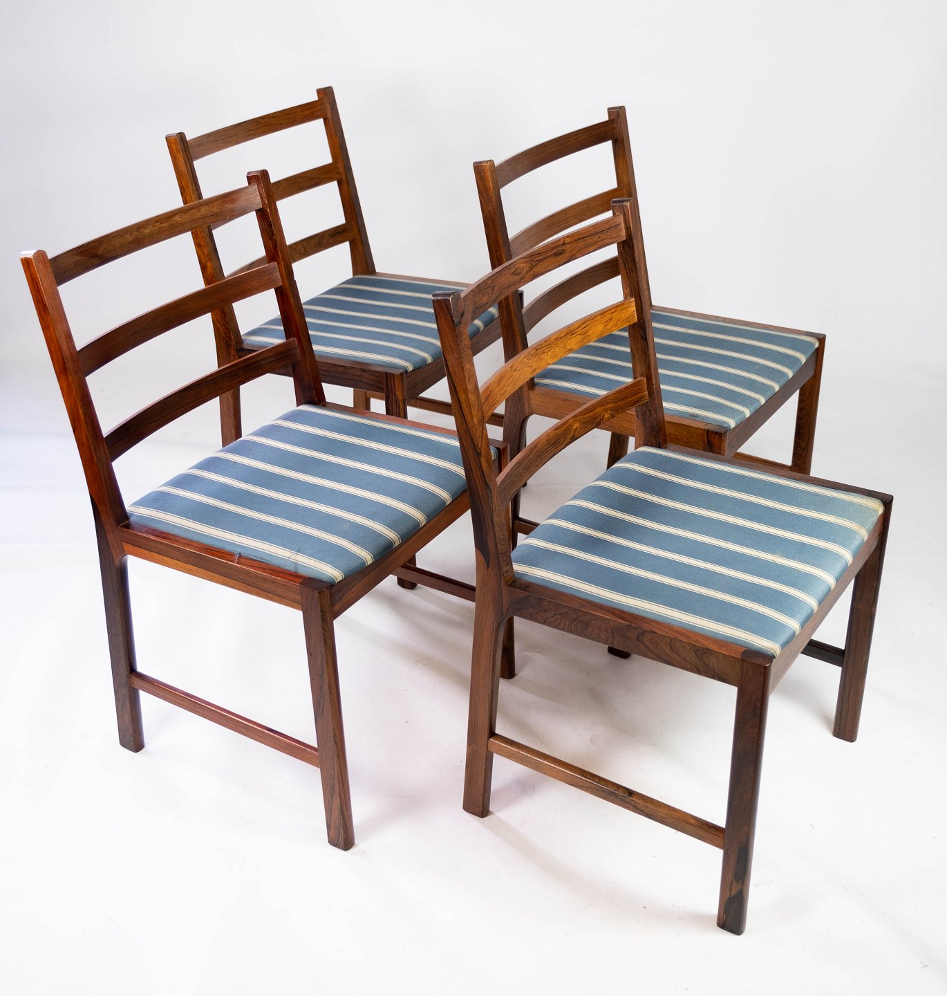 SoldA set of four dining chairs in rosewood and seats upholstered with blue striped fabric, of danish design from the 1960s. The chairs are in great vintage condition.
