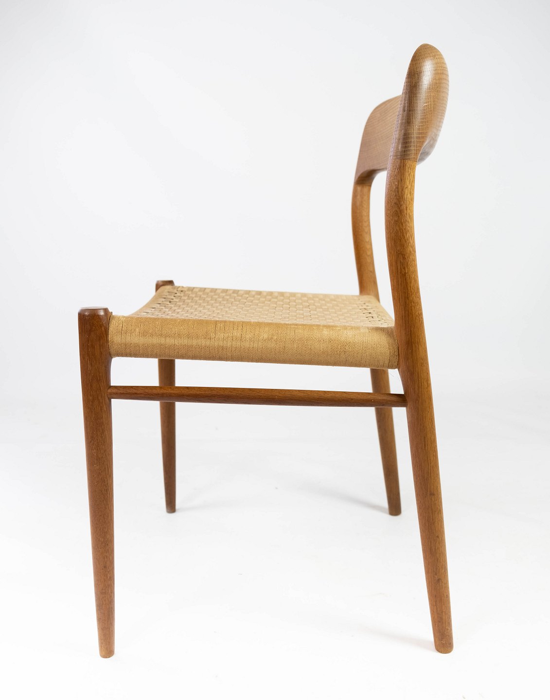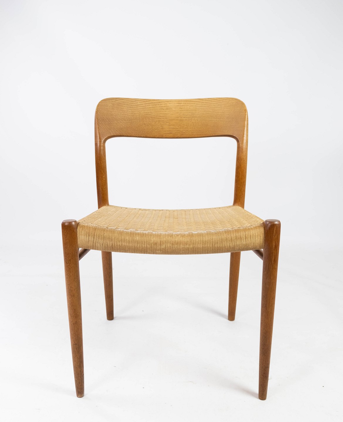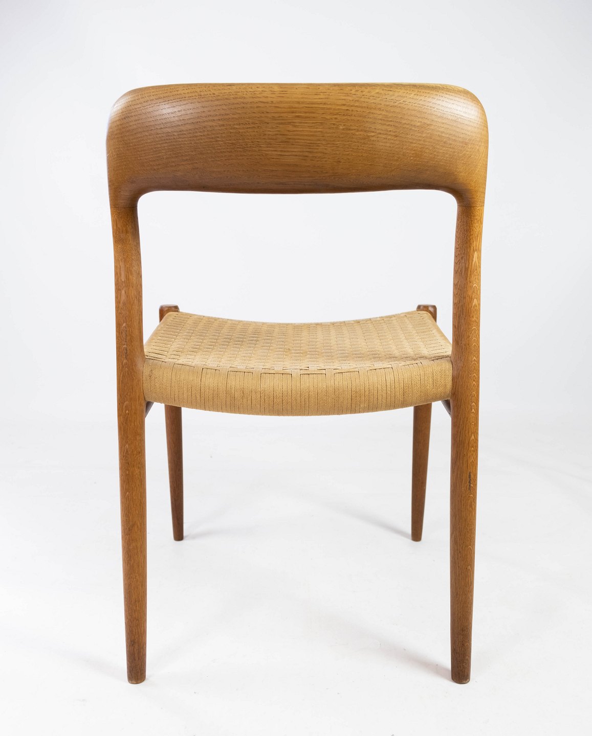 SolgtEt sæt af fire spisestuestole, model 75, i eg og papirflet designet af N.O. Møller fra 1960erne. Stolene er i flot brugt stand.