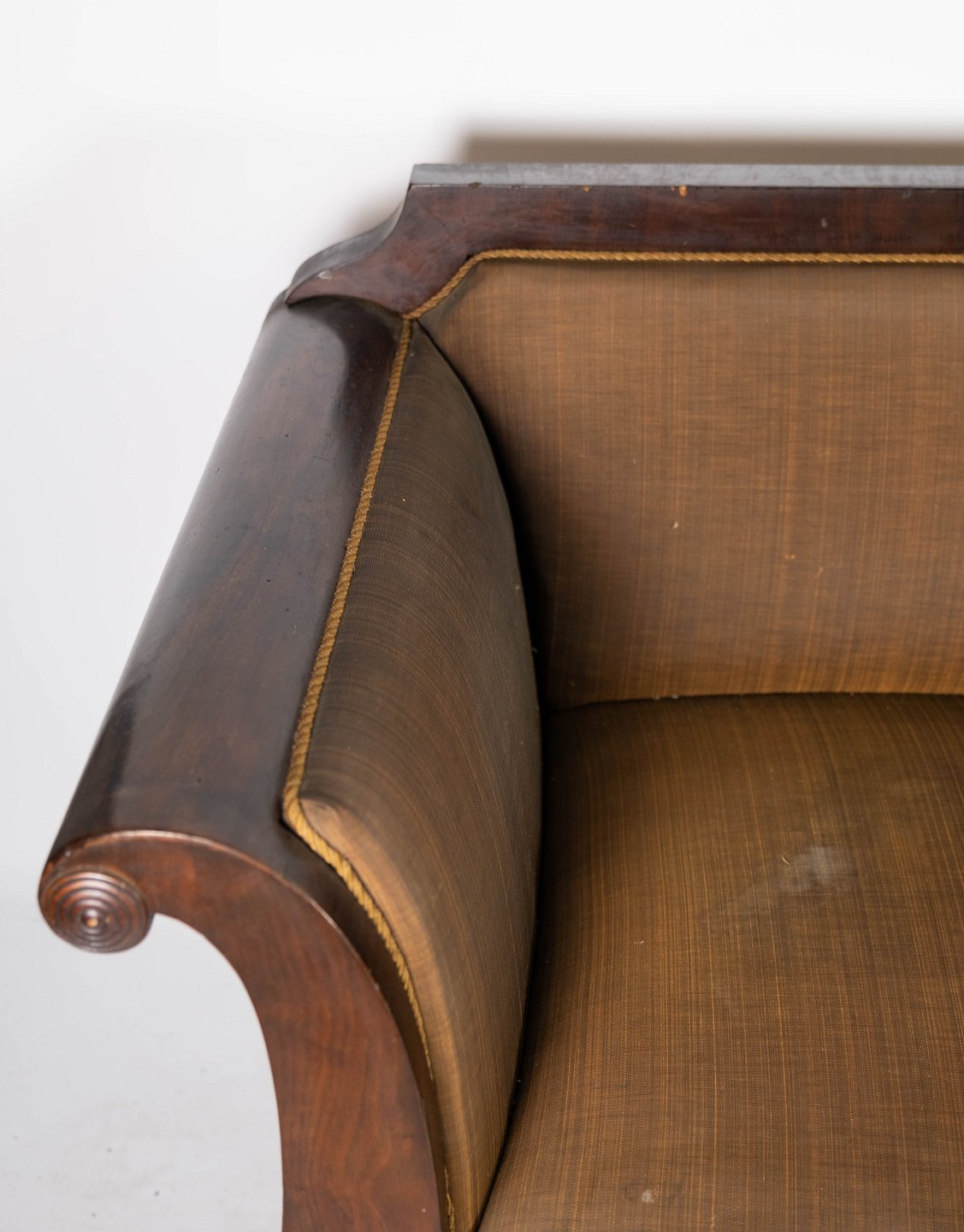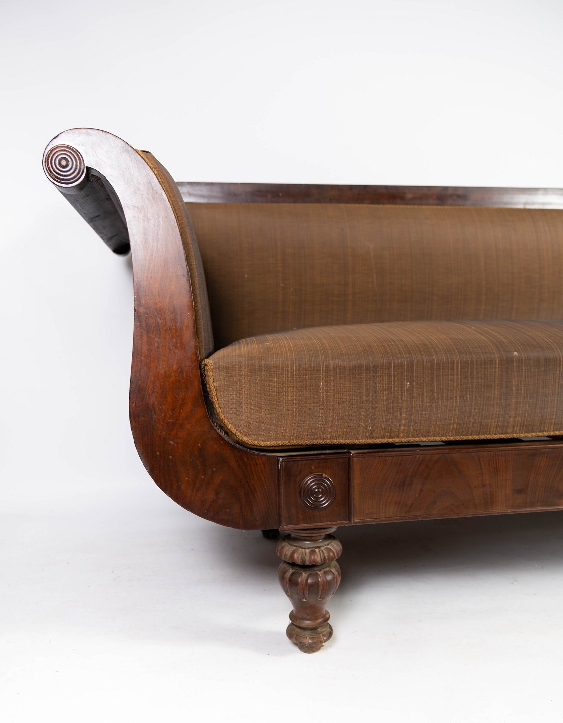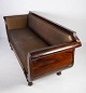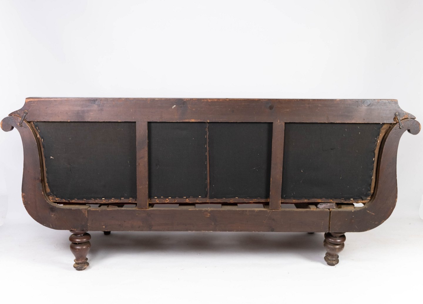 Antique sofa upholstered with brown fabric and frame of dark wood from 1860.