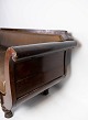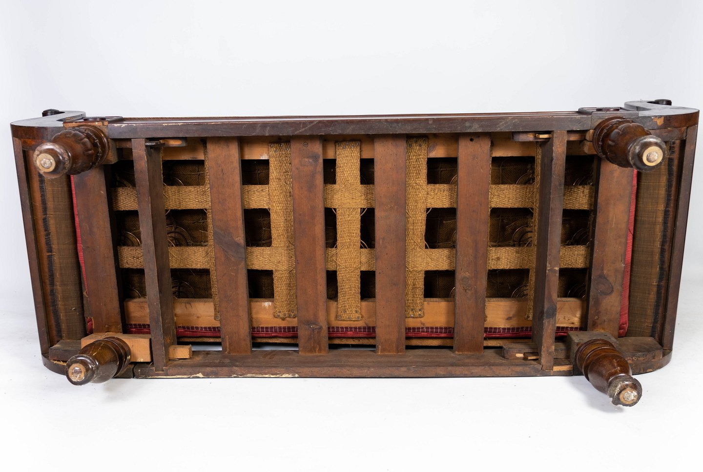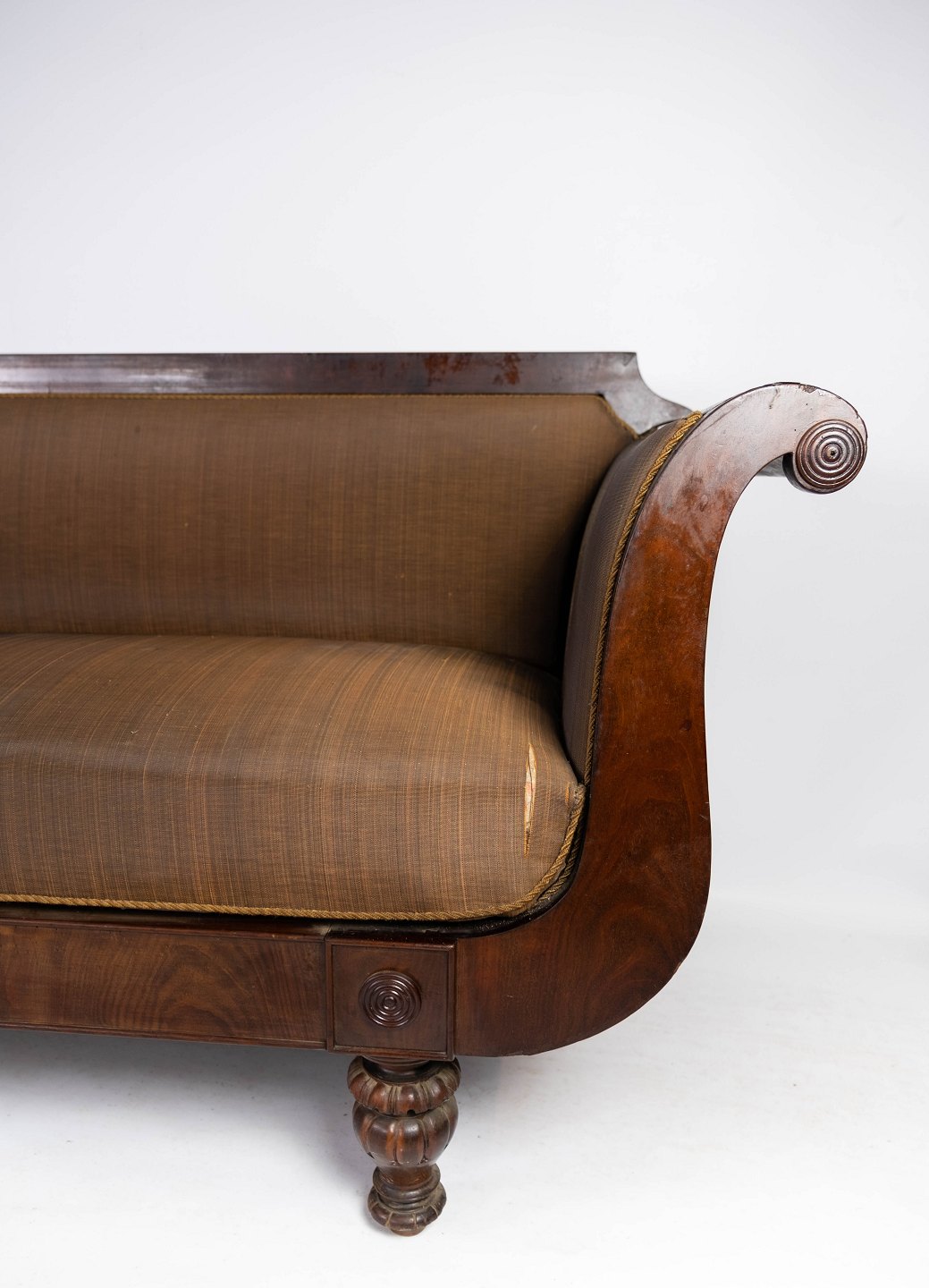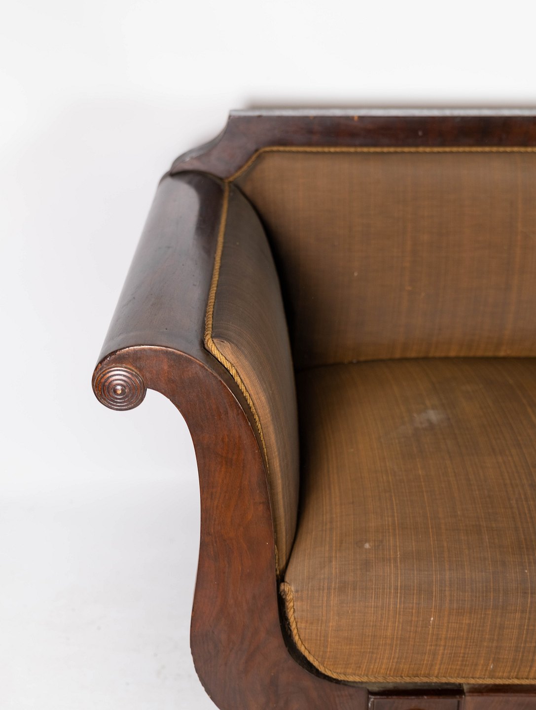 Antique sofa upholstered with brown fabric and frame of dark wood from 1860.
