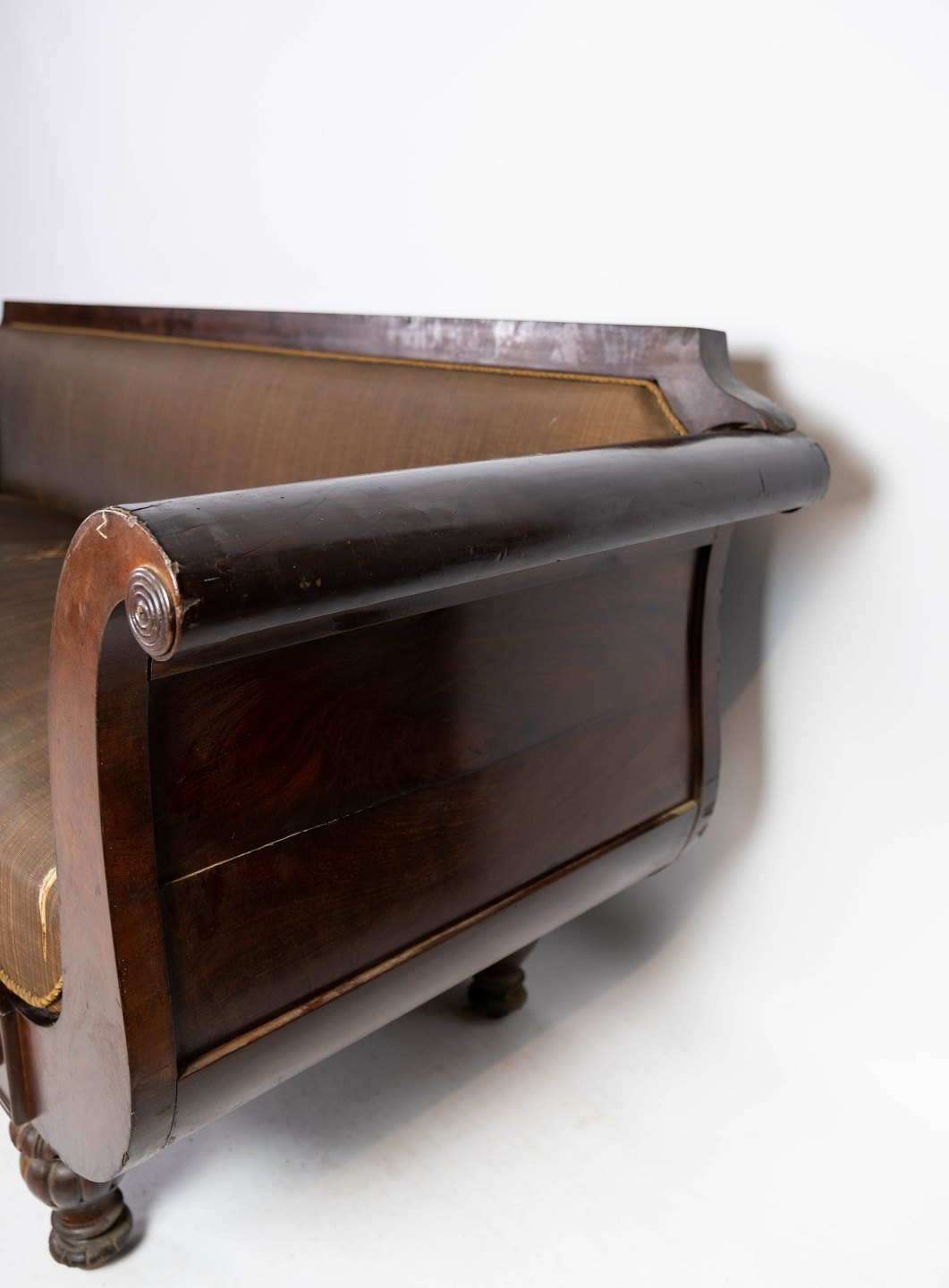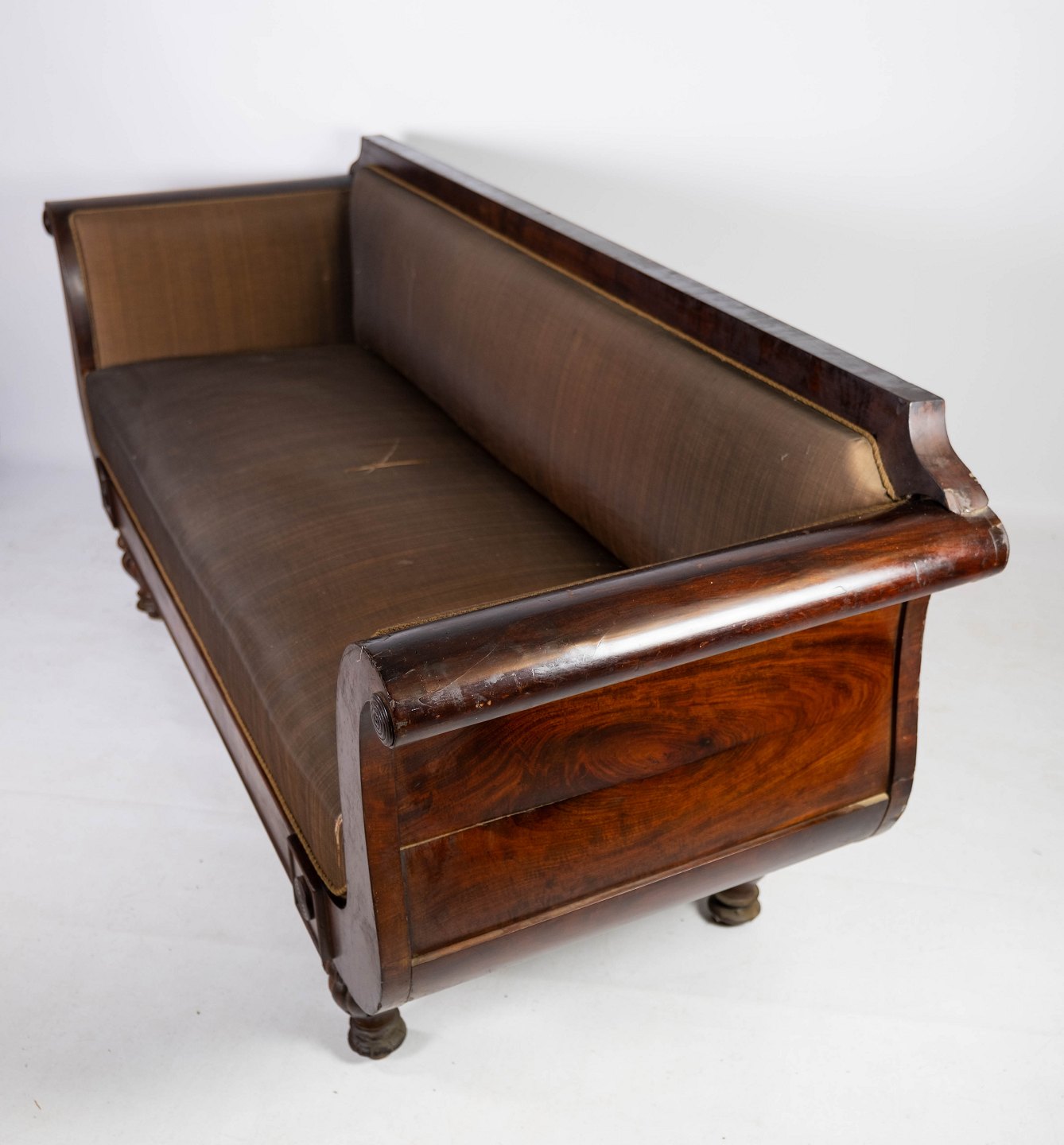 Antique sofa upholstered with brown fabric and frame of dark wood from 1860. The sofa is in great used condition.