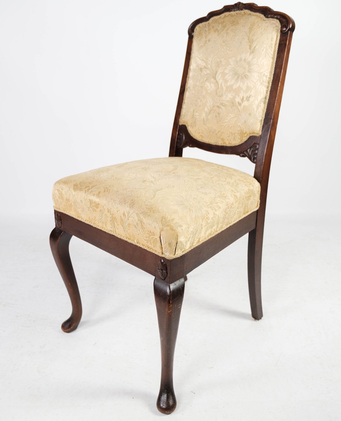 Set of dining room chairs of oak and upholstered with light fabric, in great antique condition from the 1930s.