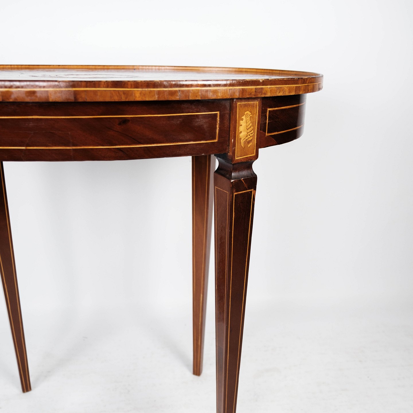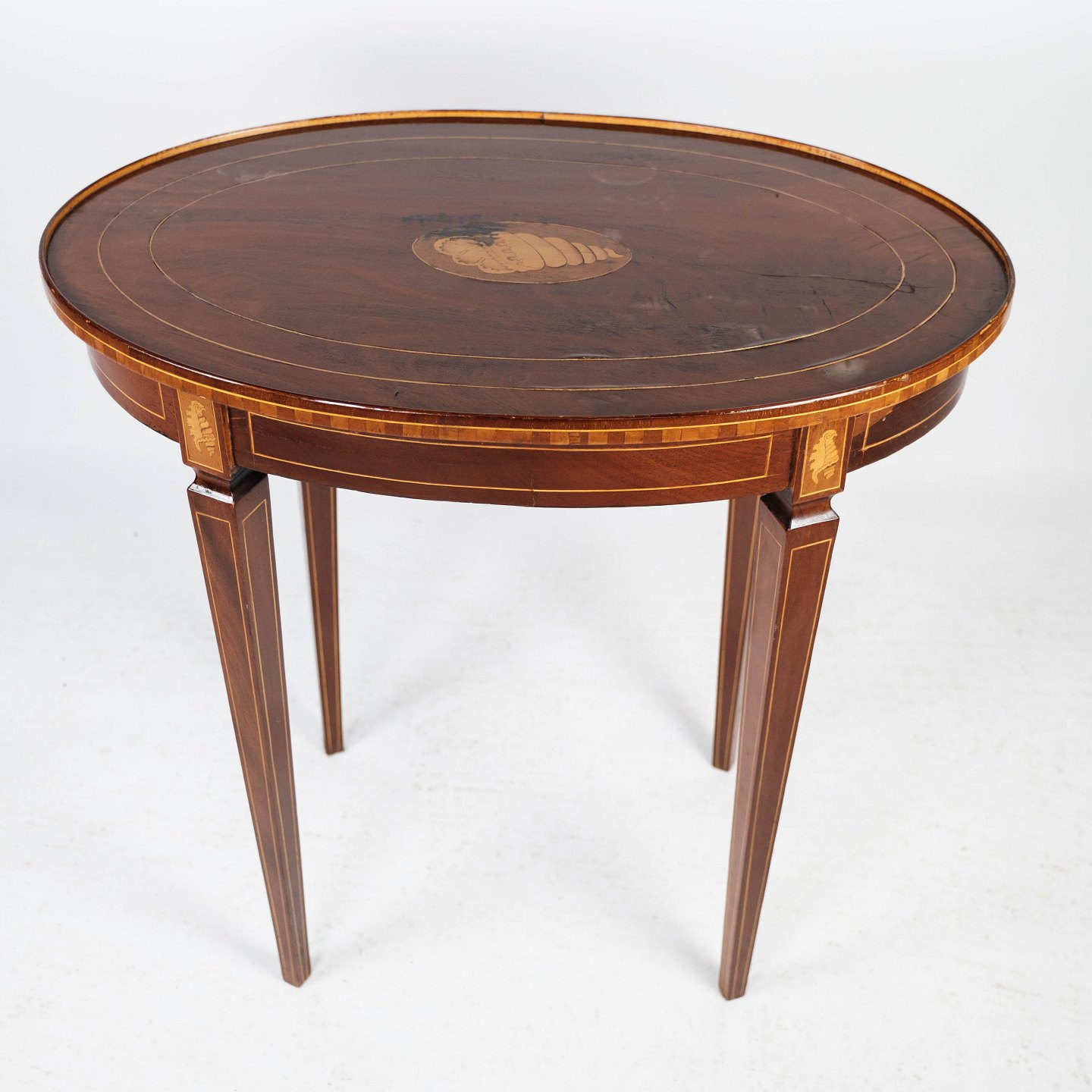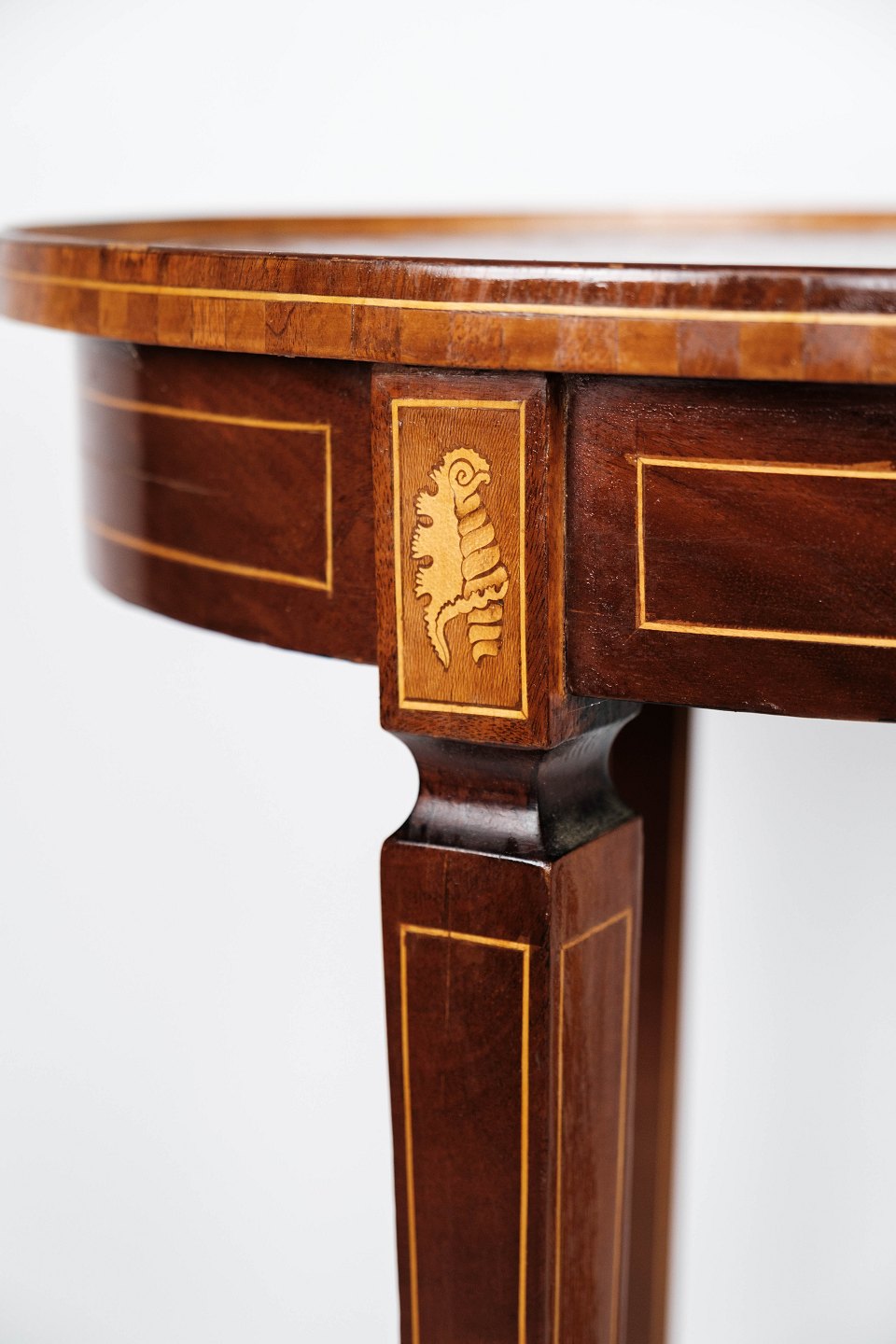 SoldLamp table of mahogany with inlaid fruit wood, in great antique condition from the 1920s.