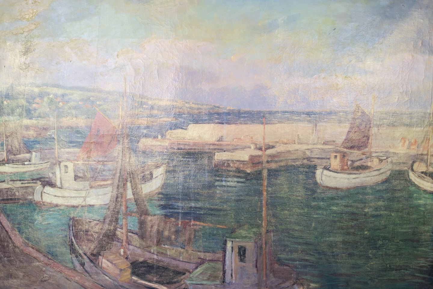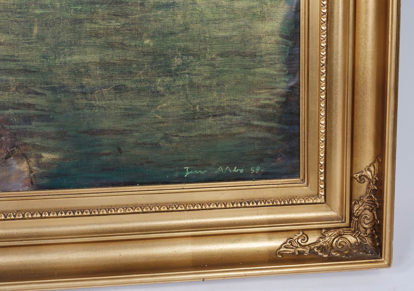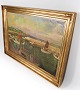 Oil painting with marine motif with gilded frame with by Jens Aabo from 1958.