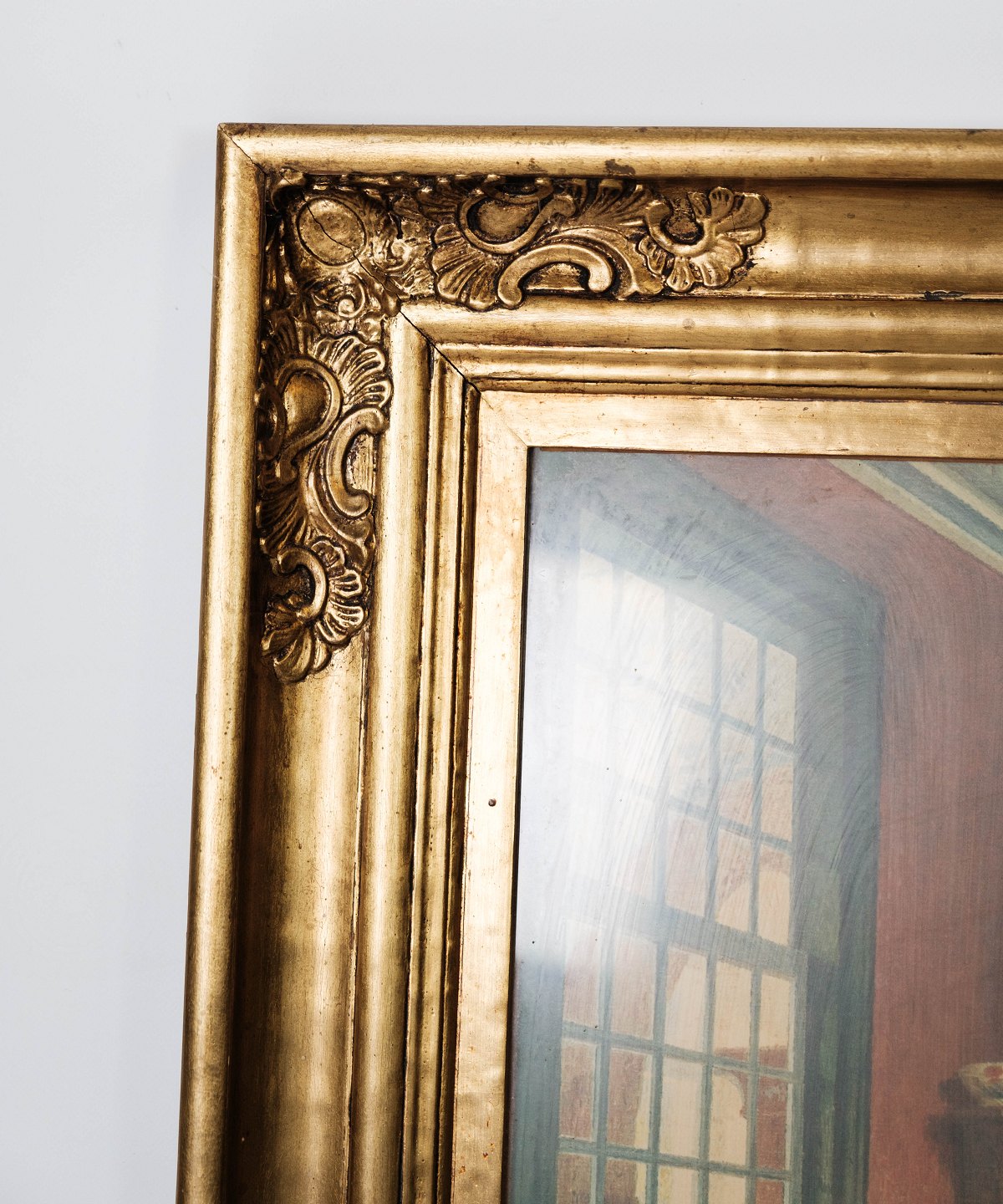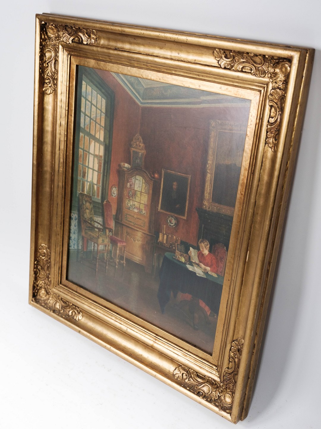 Interiør maleri på lærred med flot forgyldt ramme, fra omkring 1920.