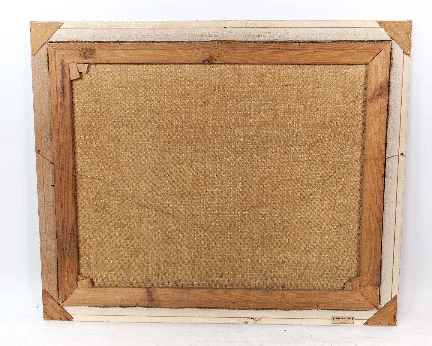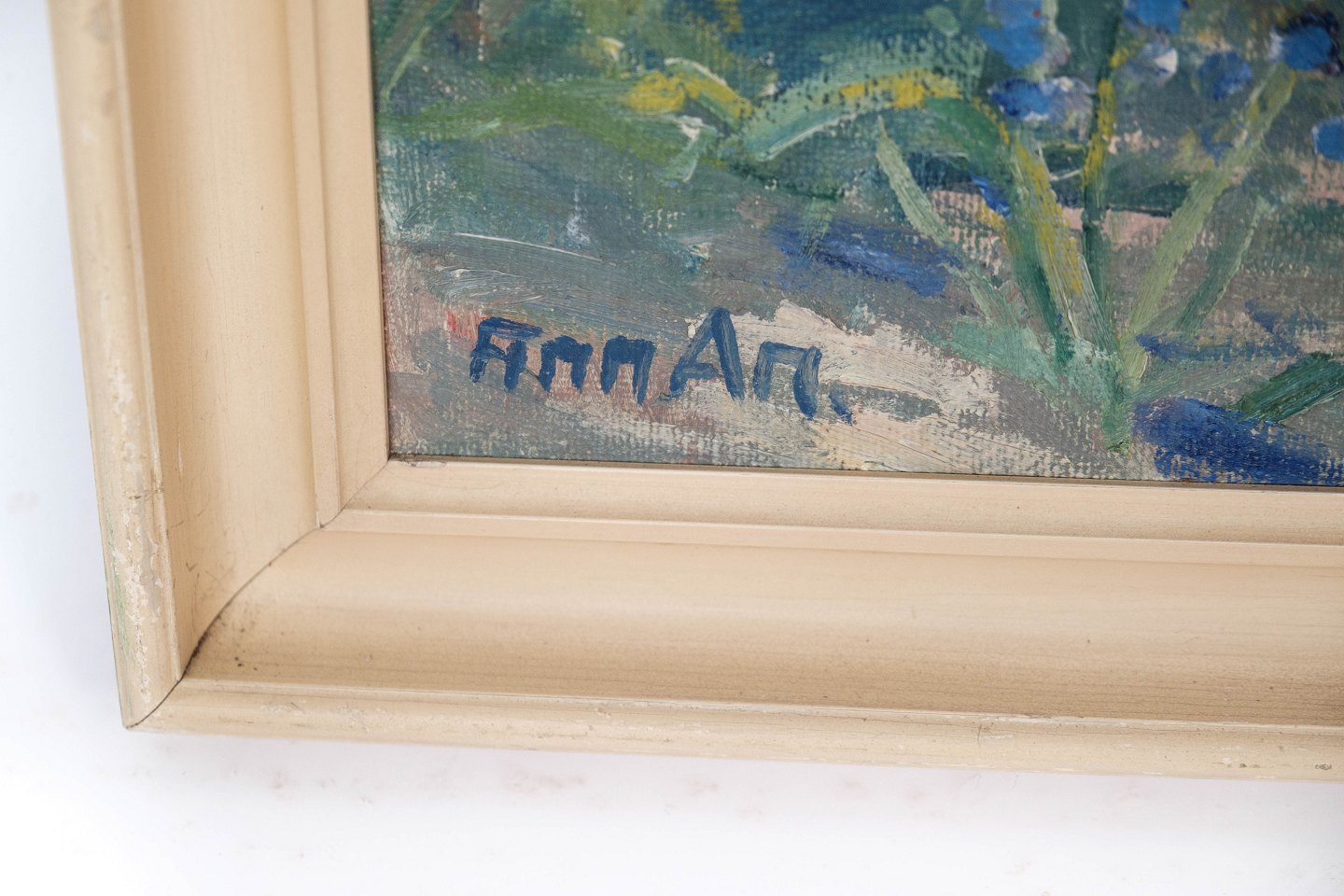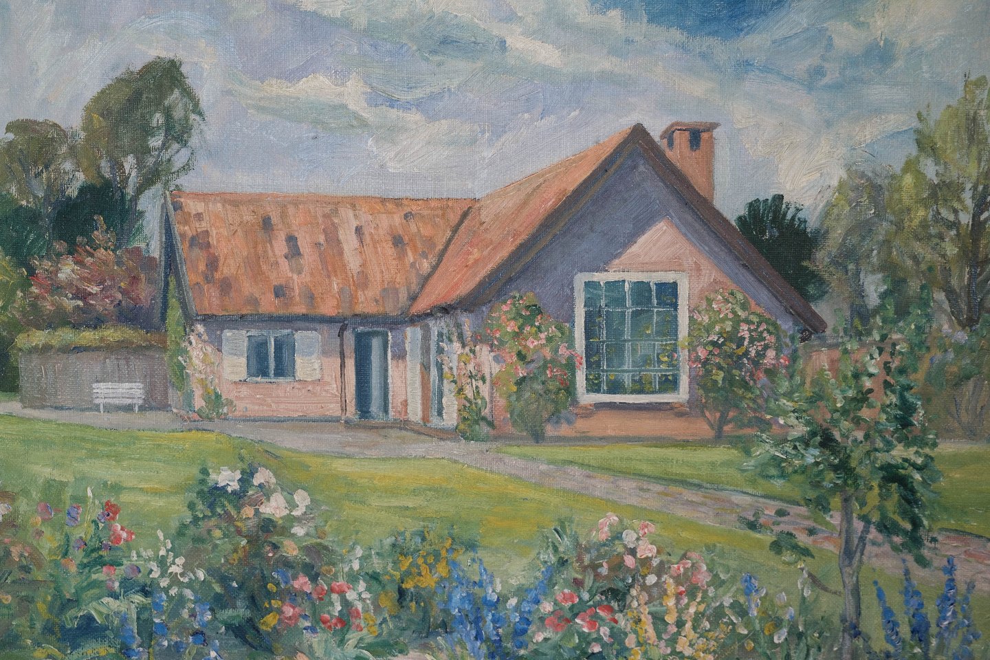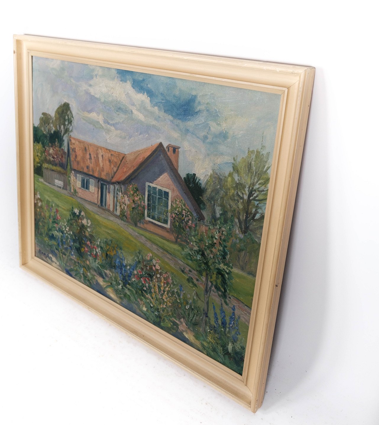 Oil painting with motif og house and light frame, with unknown signature from around 1920.