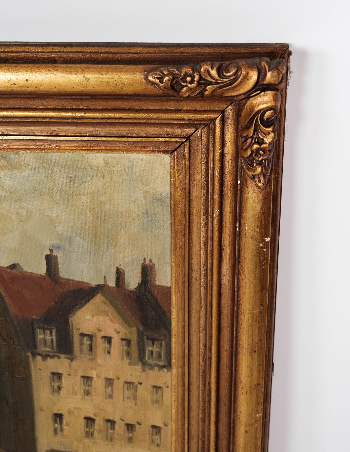 Oil painting with motif of Copenhagen and gilded frame, signed by Valdemar Brunø.