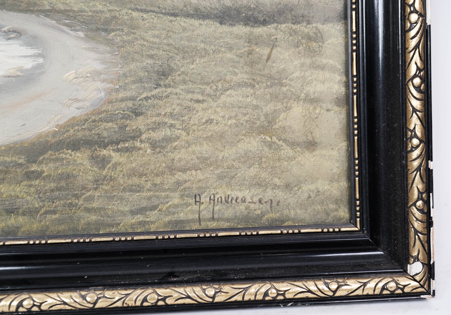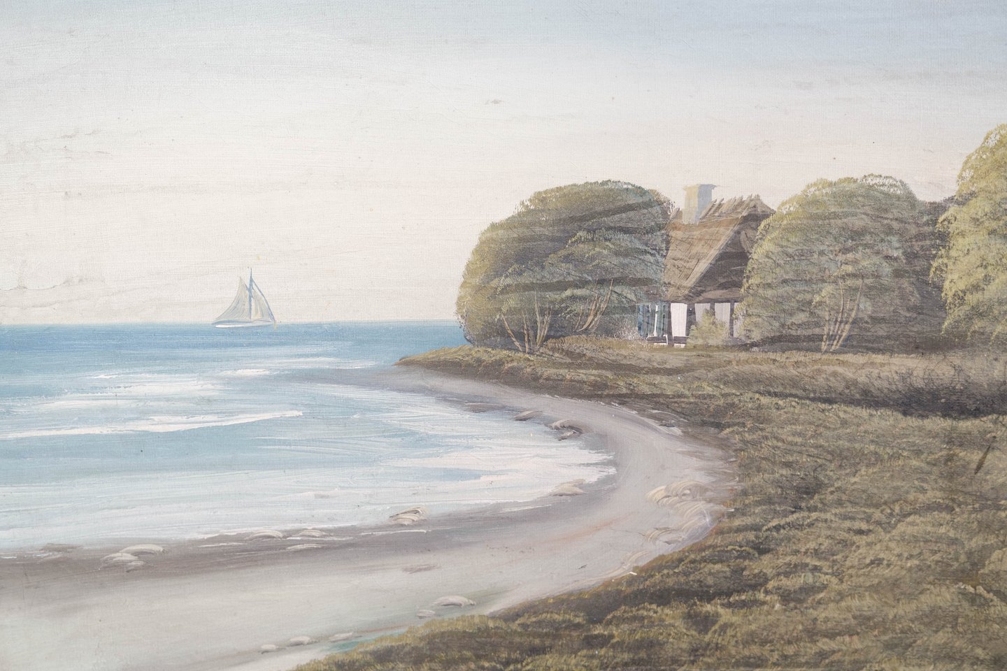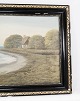 Painting on canvas with beach motif and black frame, with unknown signature.
