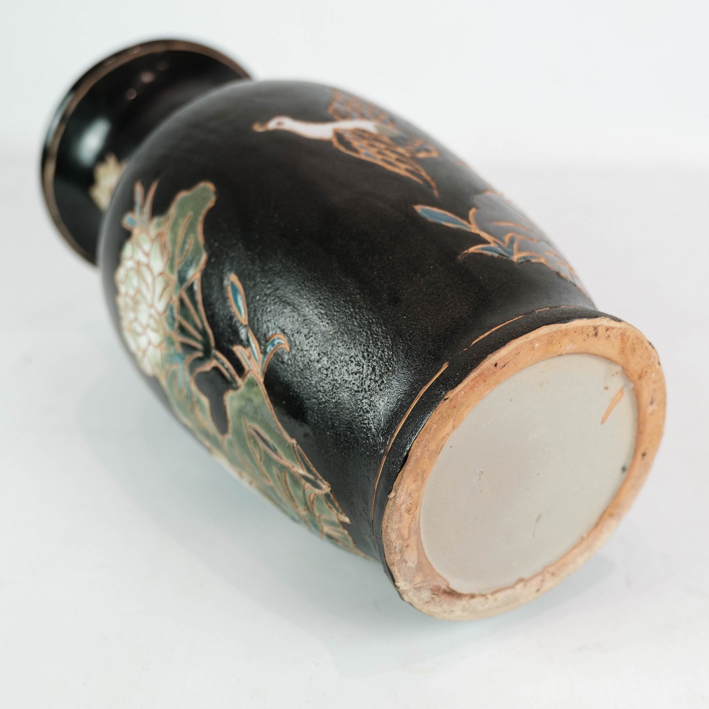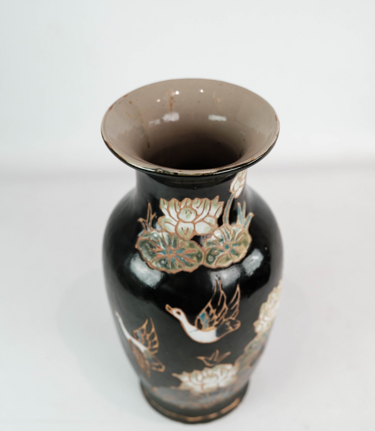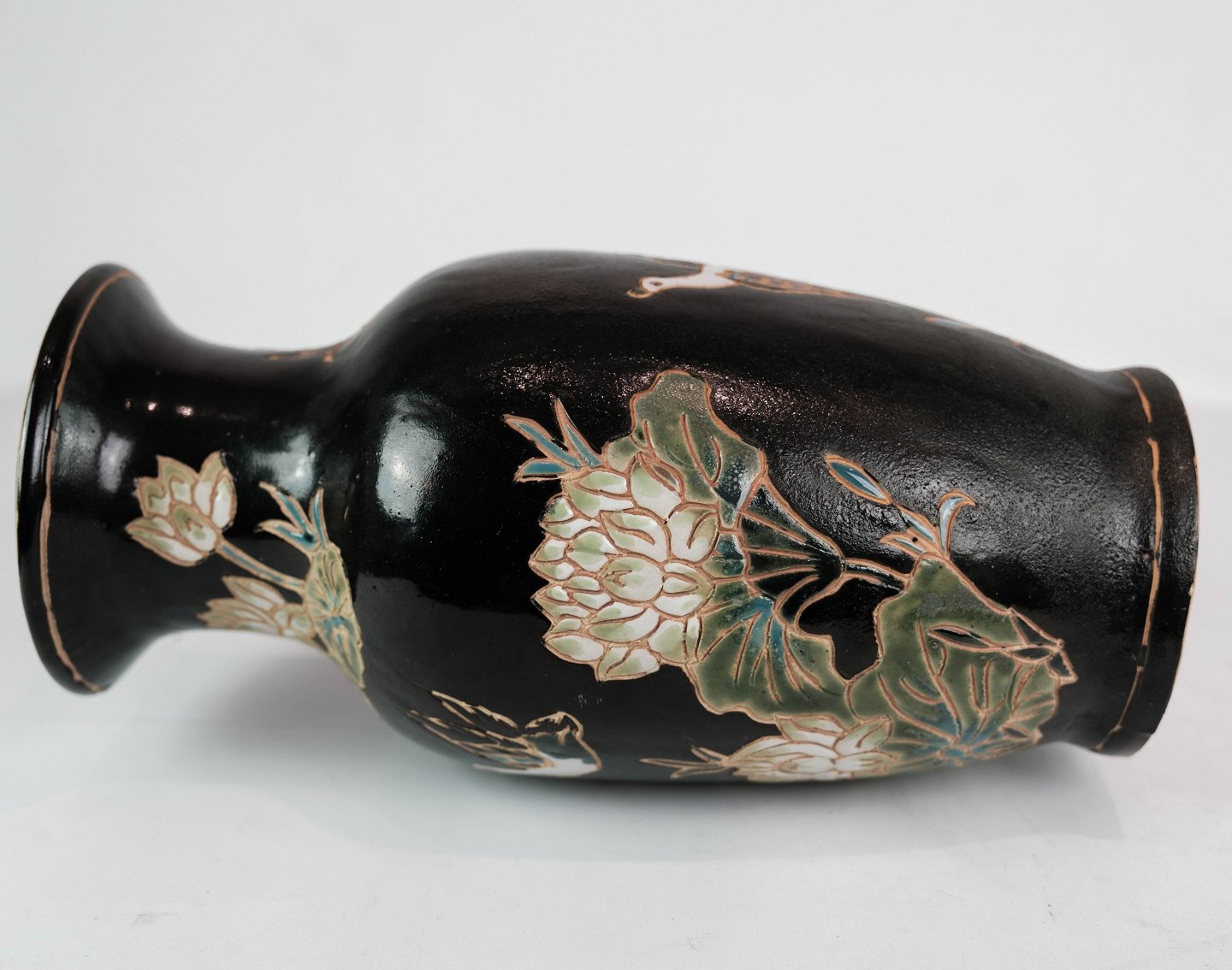 Ceramic vase with black glaze and decorated with flowers. The vase is in great vintage condition.