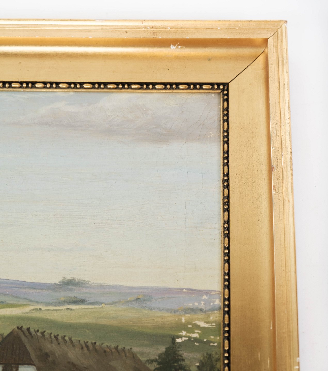 Maleri på lærred med land motiv og forgyldt ramme, med ukendt signatur fra 1900erne.