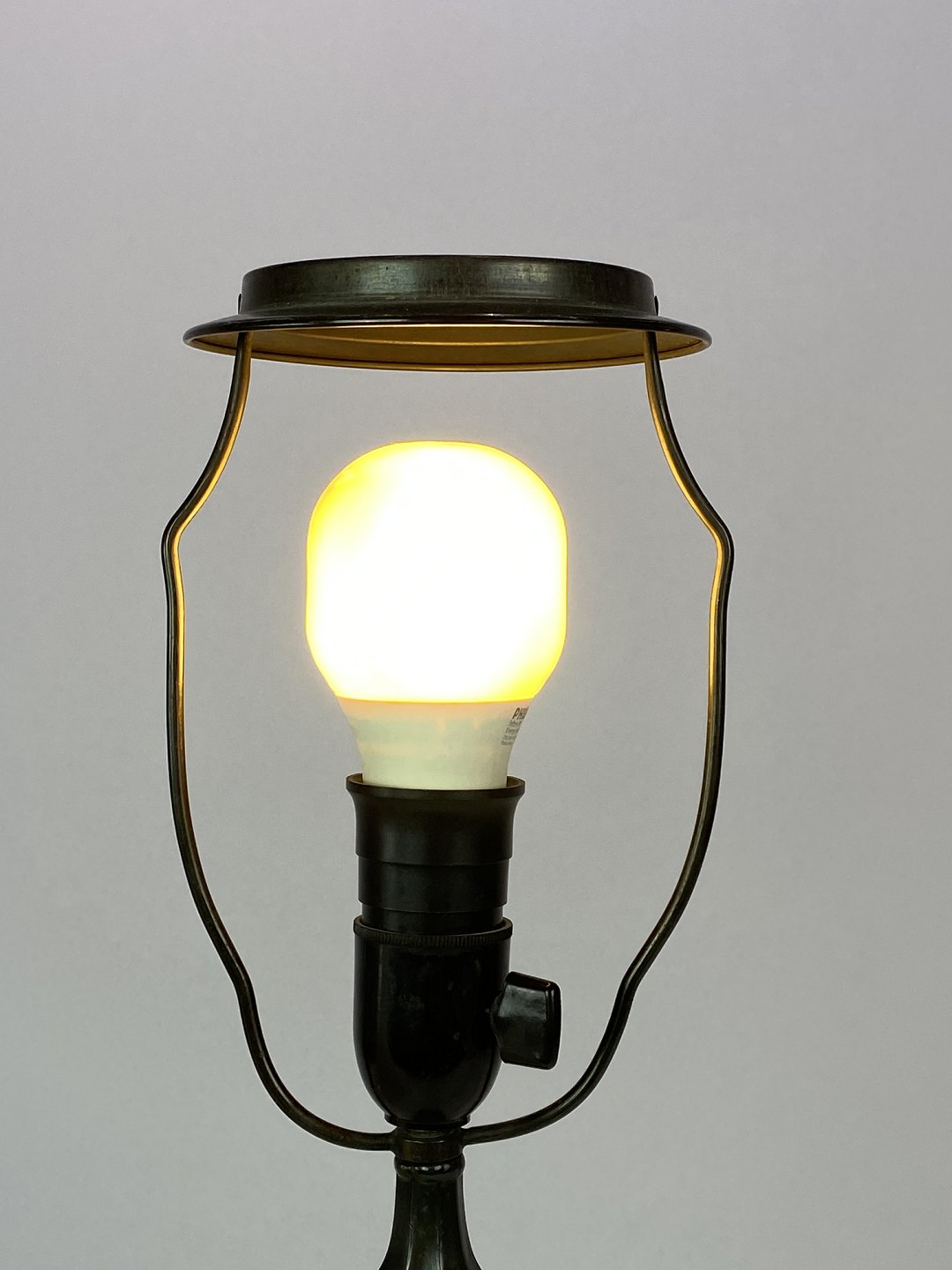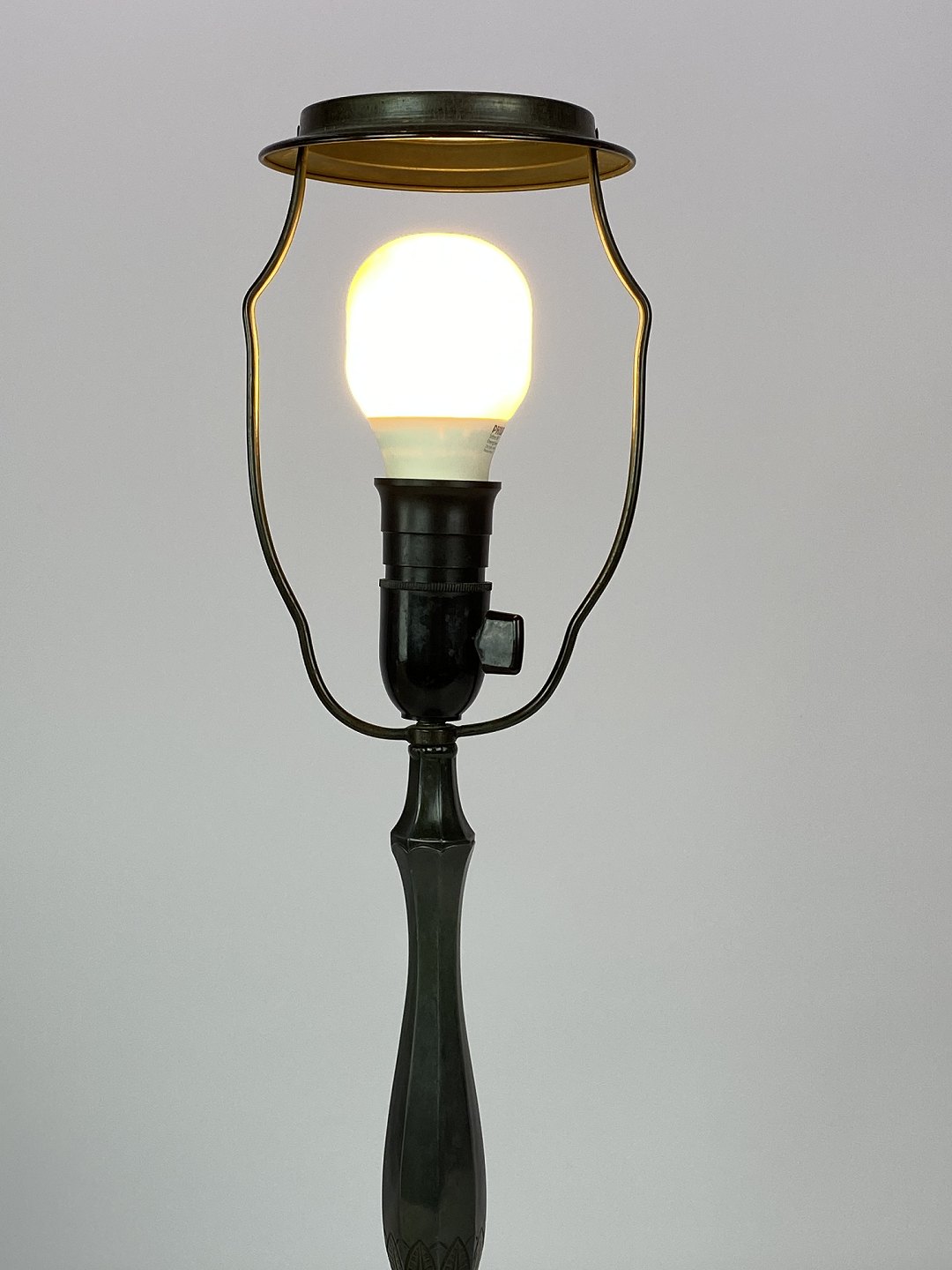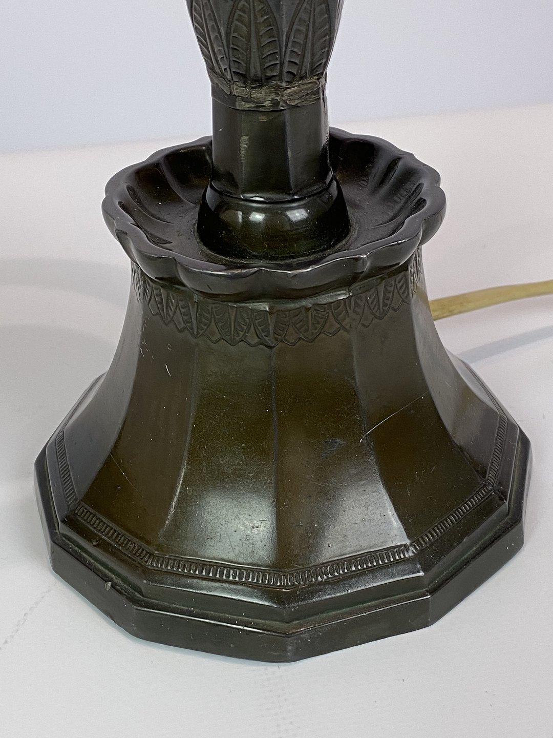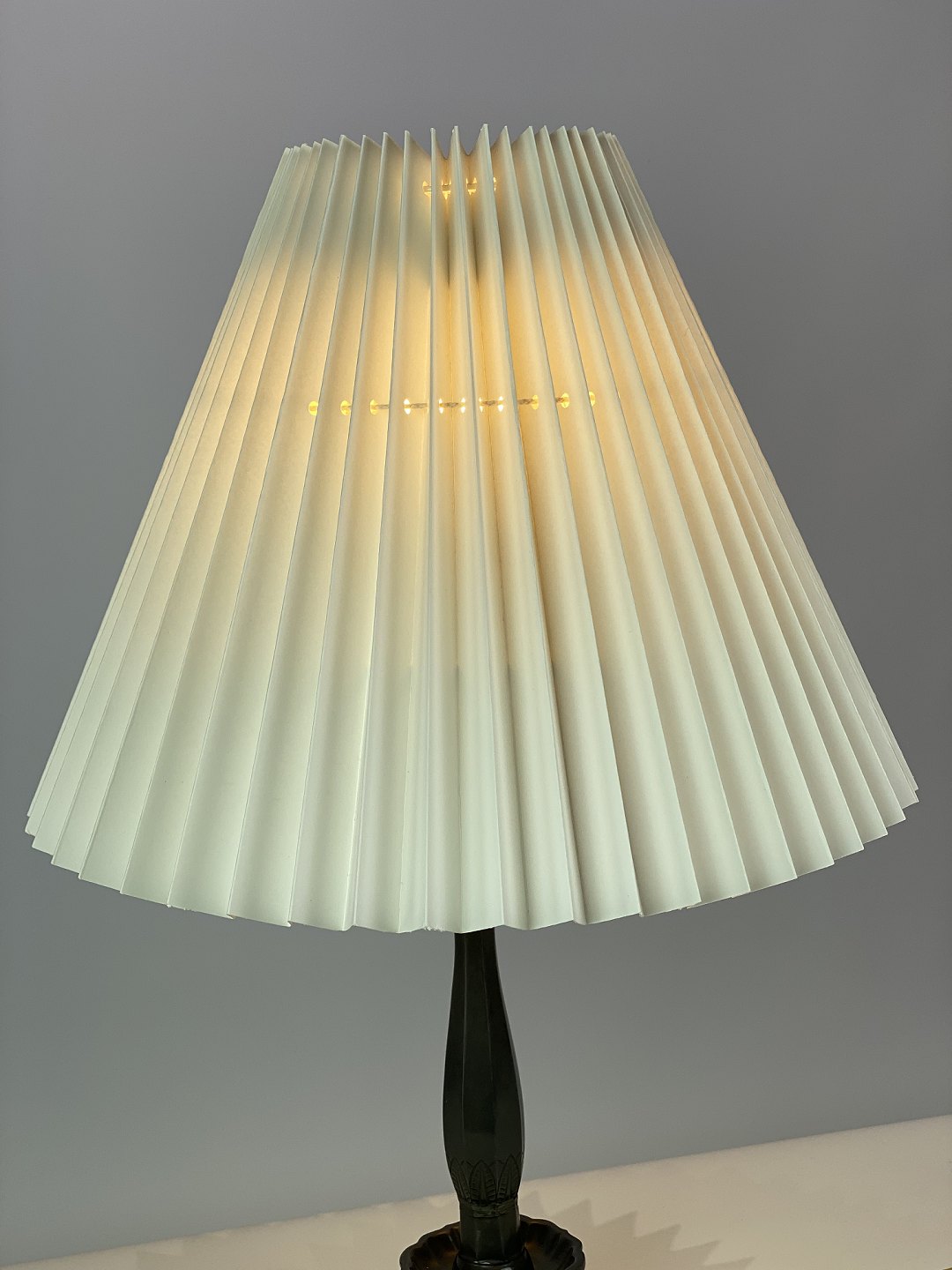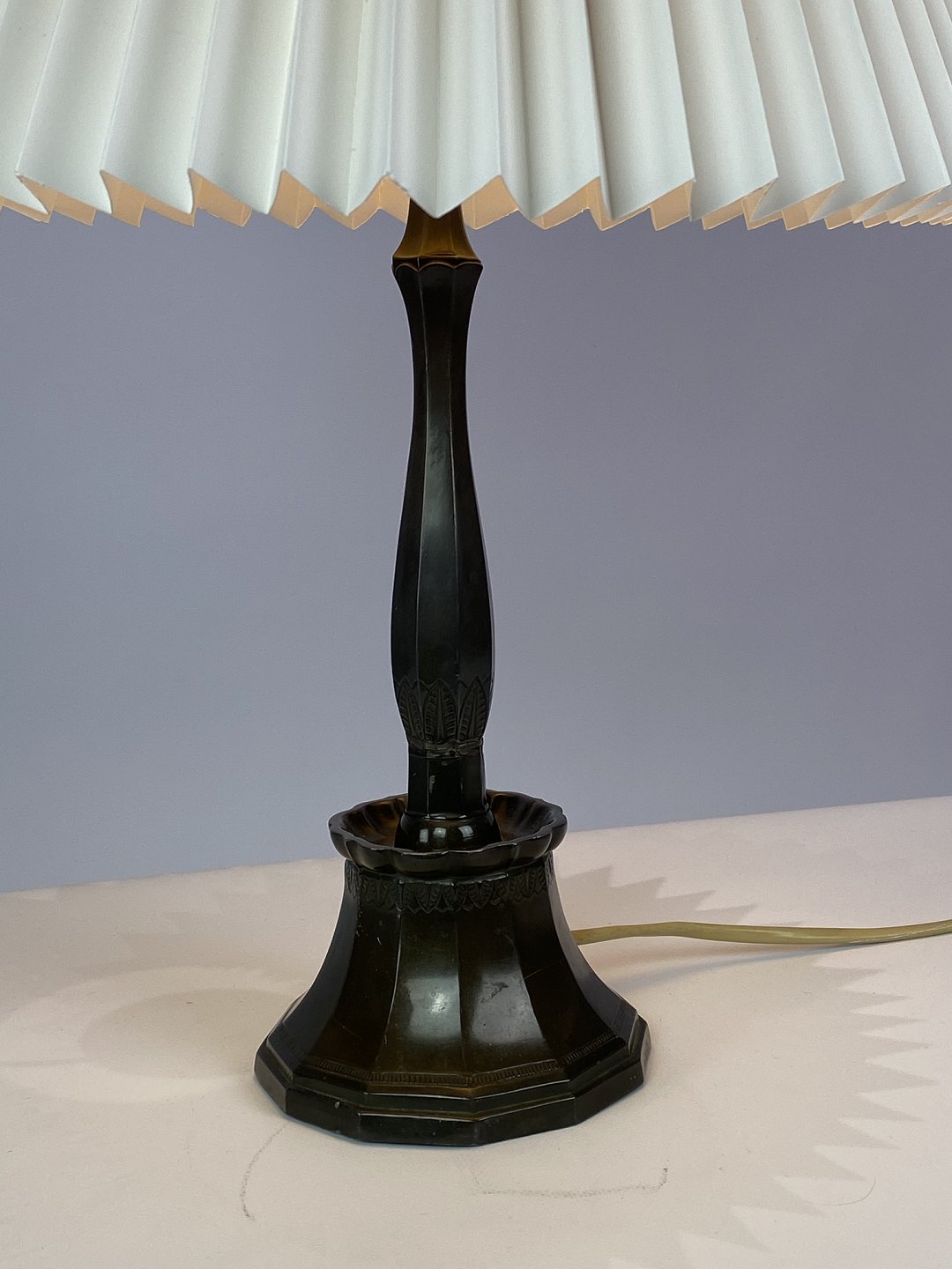 SolgtBordlampe i diskometal af Just Andersen med papir skærm, fra 1930erne. Lampen er i flot brugt stand.