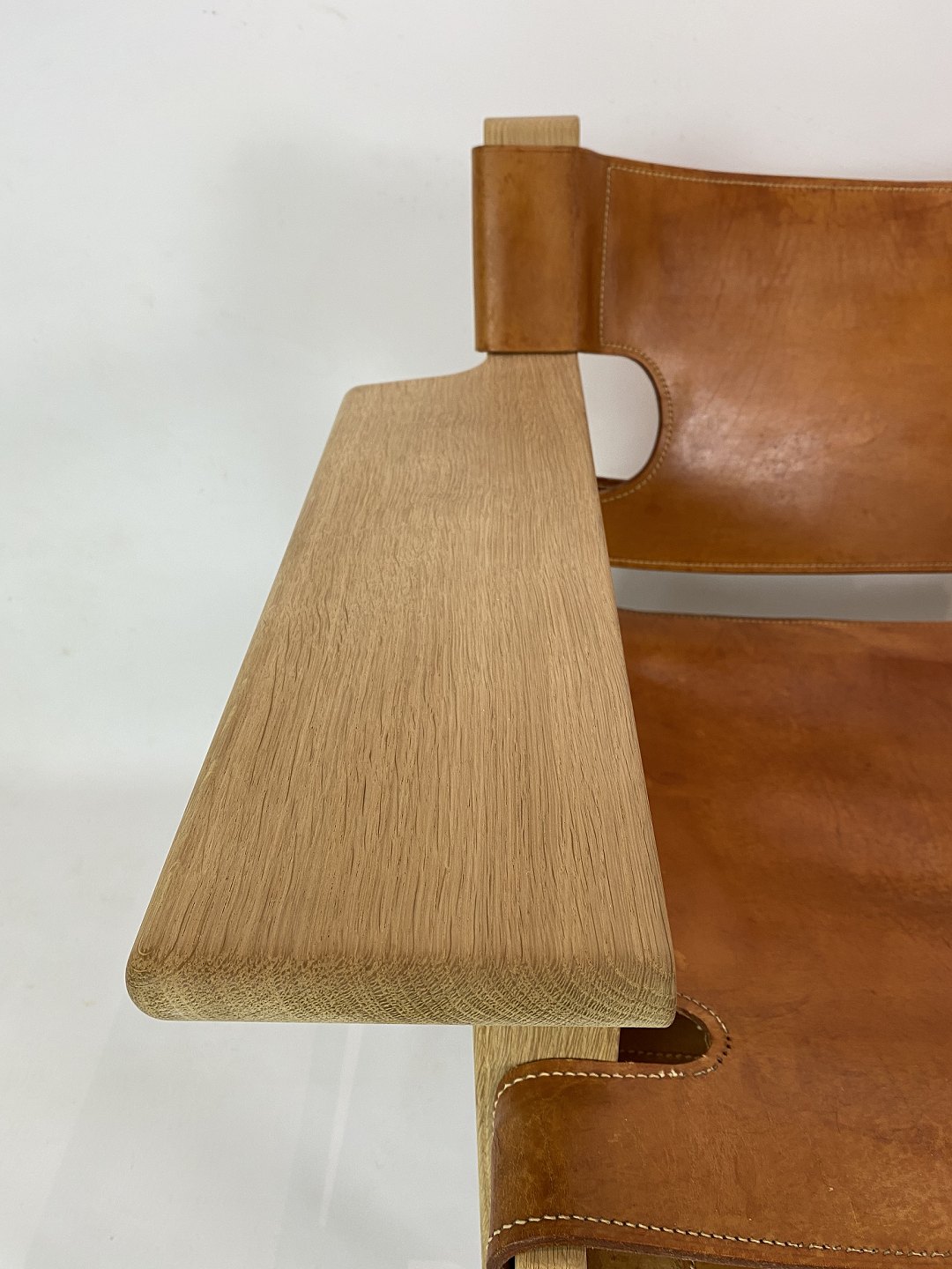 The Spanish chair, model BM2226, designed by Børge Mogensen in 1958 and manufactured by Fredericia Furniture, is an iconic representation of Danish furniture design. This chair is made of solid oak and is upholstered in patinated leather in a beautiful cognac color, giving it a timeless and sophisticated look.