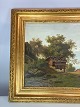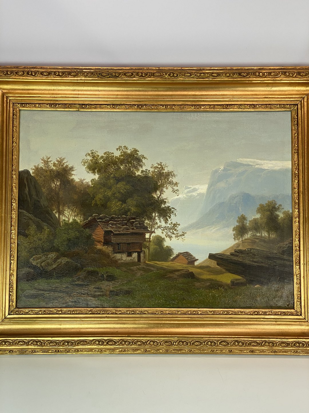 Painting on canvas with motif of the Swiss alps and with wide gilded frame, from around 1680.