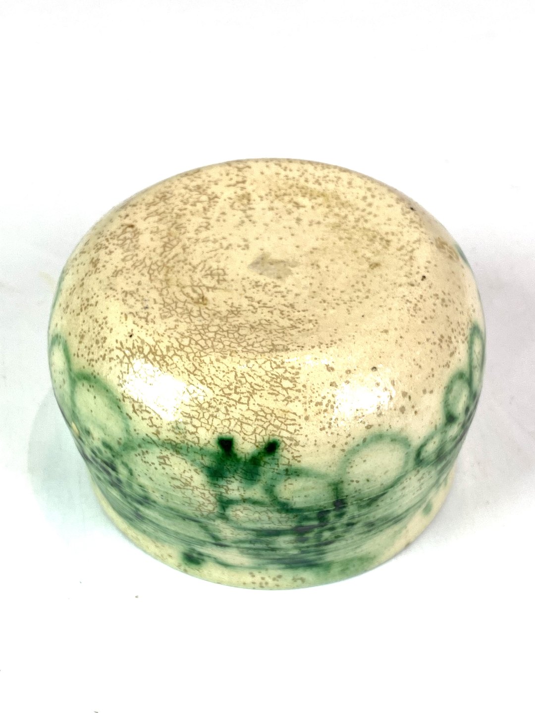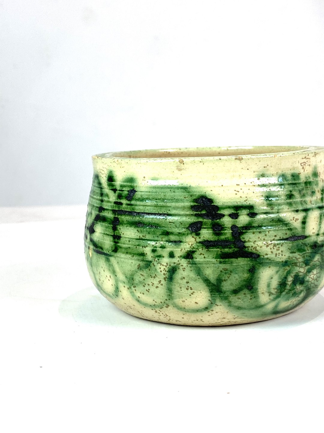 Ceramic bowl with light glaze and green pattern from the 1940s.