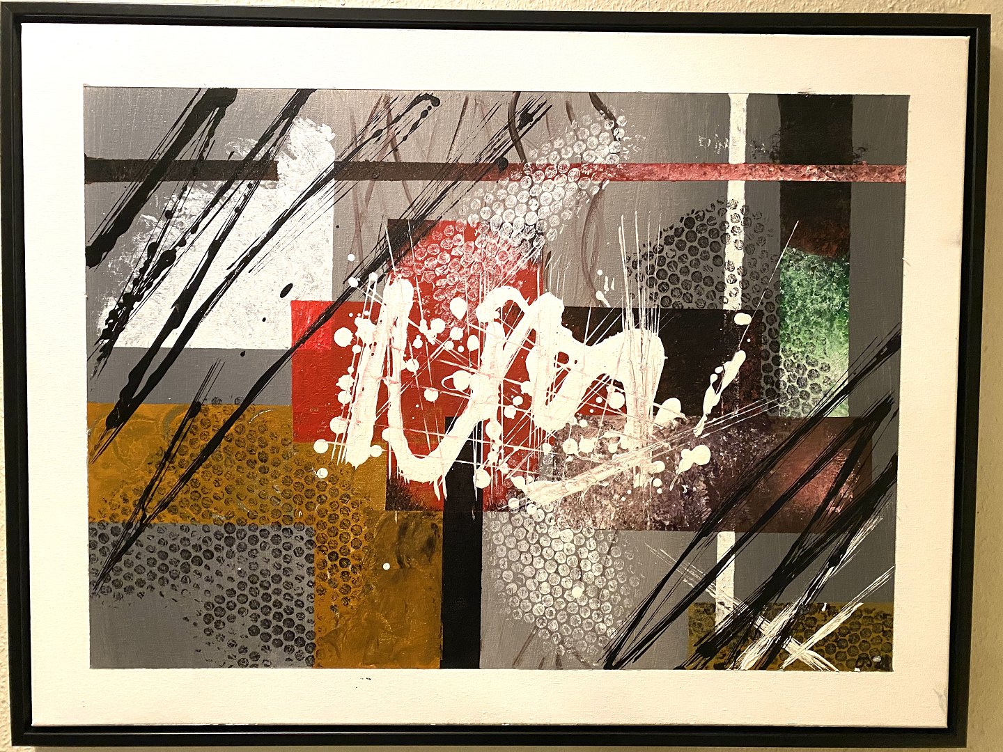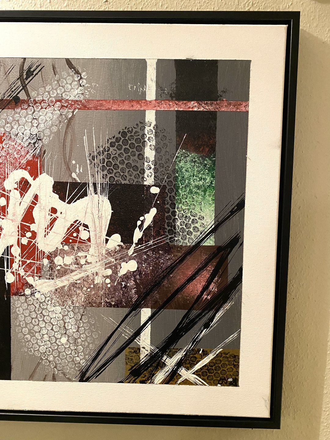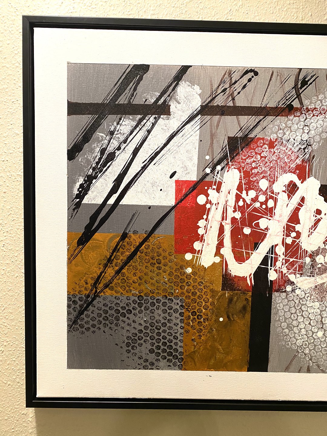 Modern painting on canvas with abstract motif signed O.J. 2021. The painting is with a black frame.
