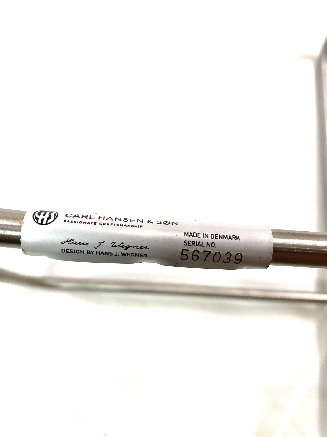 Tray table from Carl Hansen & Søn, designed by Hans J. Wegner. The tray table consists of 2 parts. A collapsible legs and a tray. The legs is made of stainless steel and the table top is made of walnut veneer. The wood is oiled oak.
