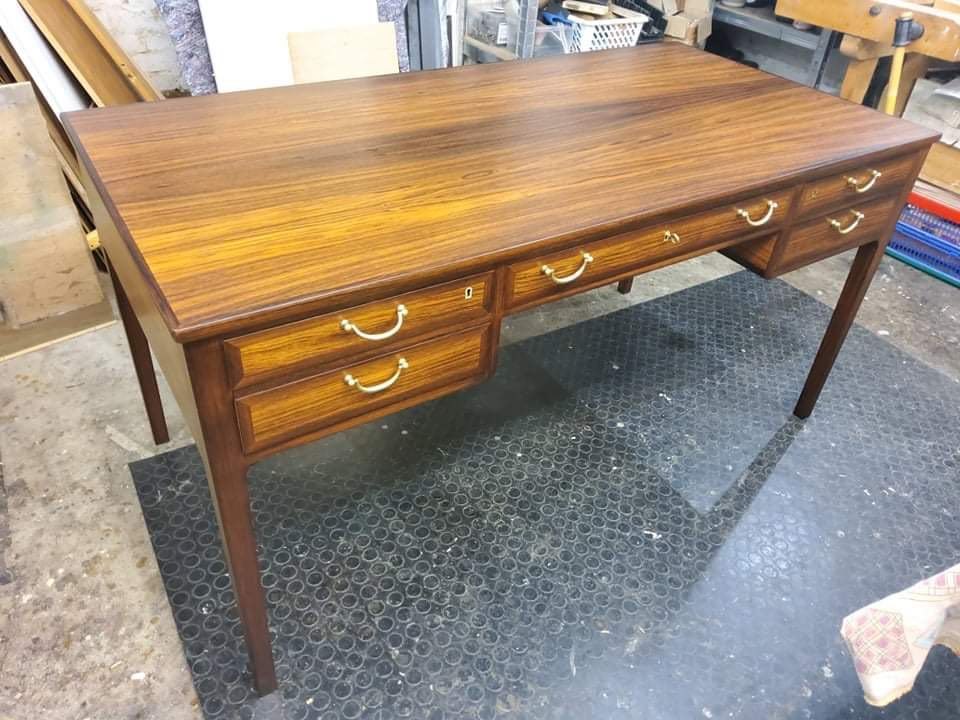 Here you can see a desk that we got in through an insurance case, a fire damage. All furniture can be fine restored. It just depends on hourly consumption. The desk was designed by Ole Wanscher for A.J Iversen in the rosewood type.