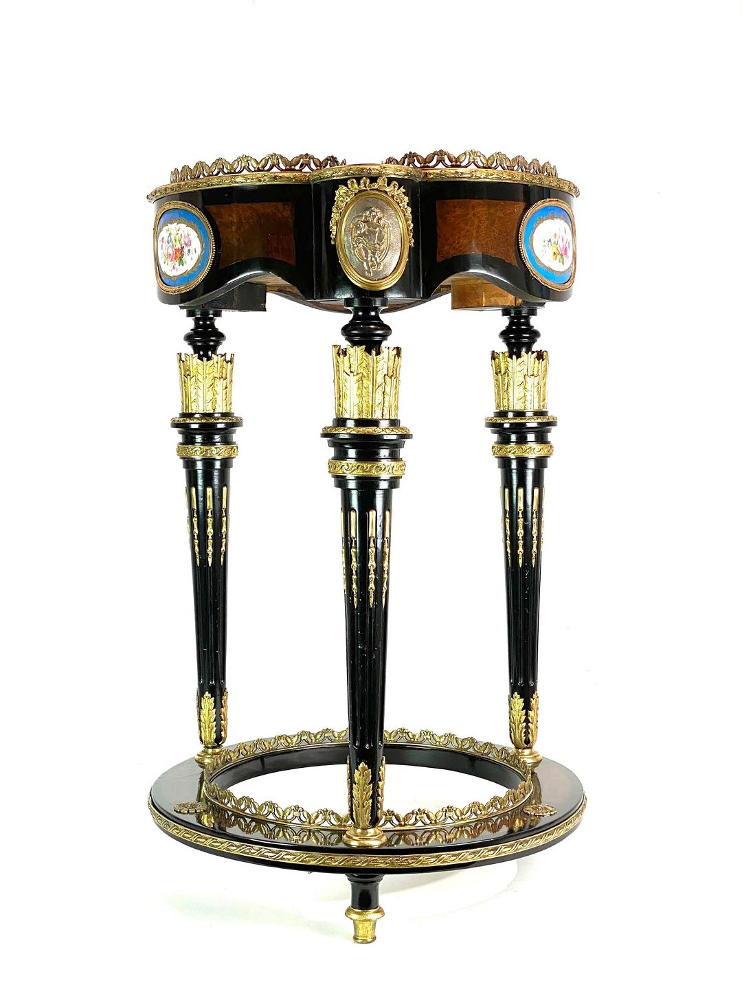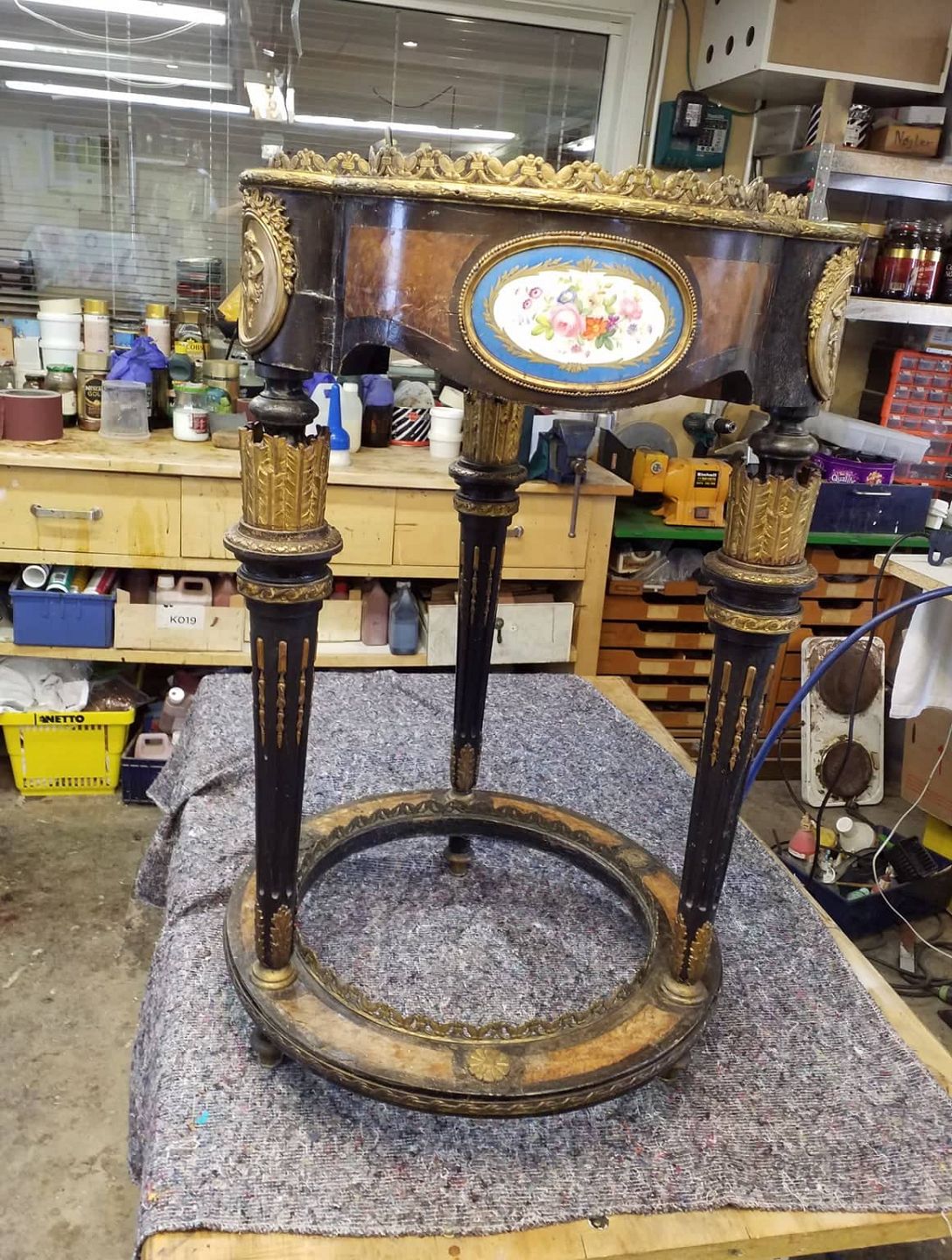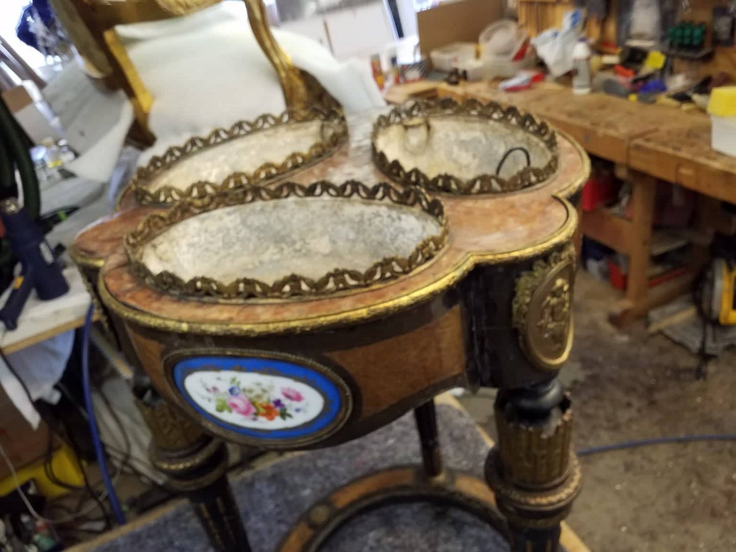 Here you can see a renovation of a French flower basin with bronze from around the 1820s with inertia, which means inlaid wood in different types of wood here including Walnut and black ebony.