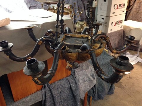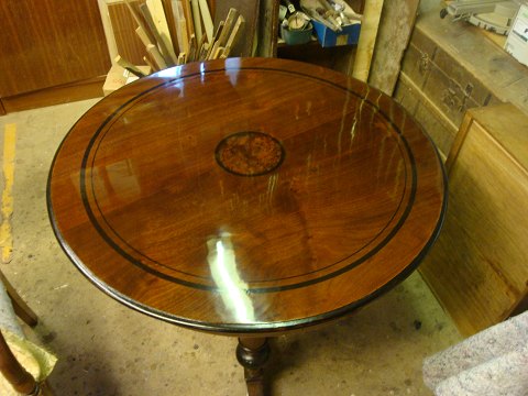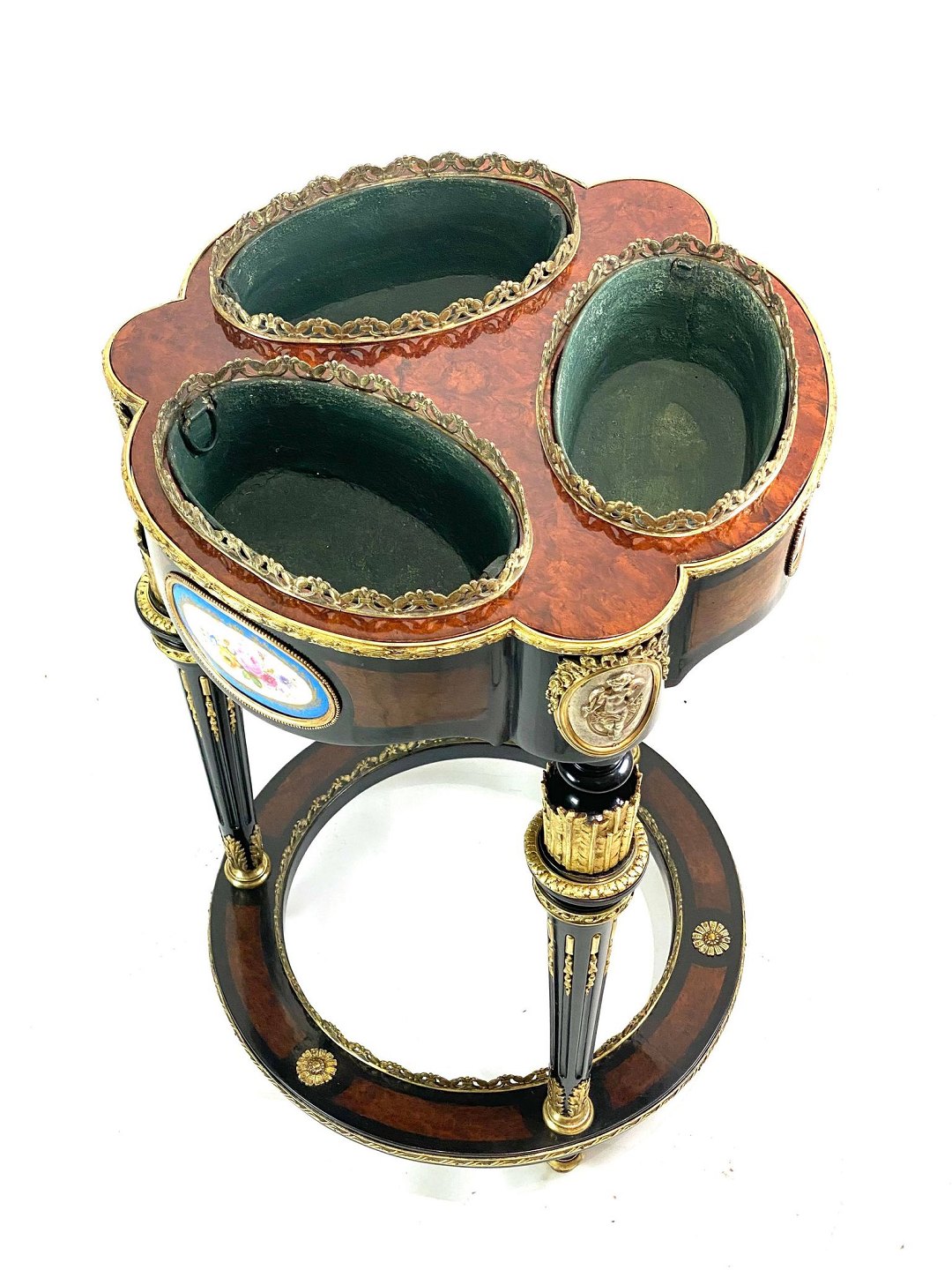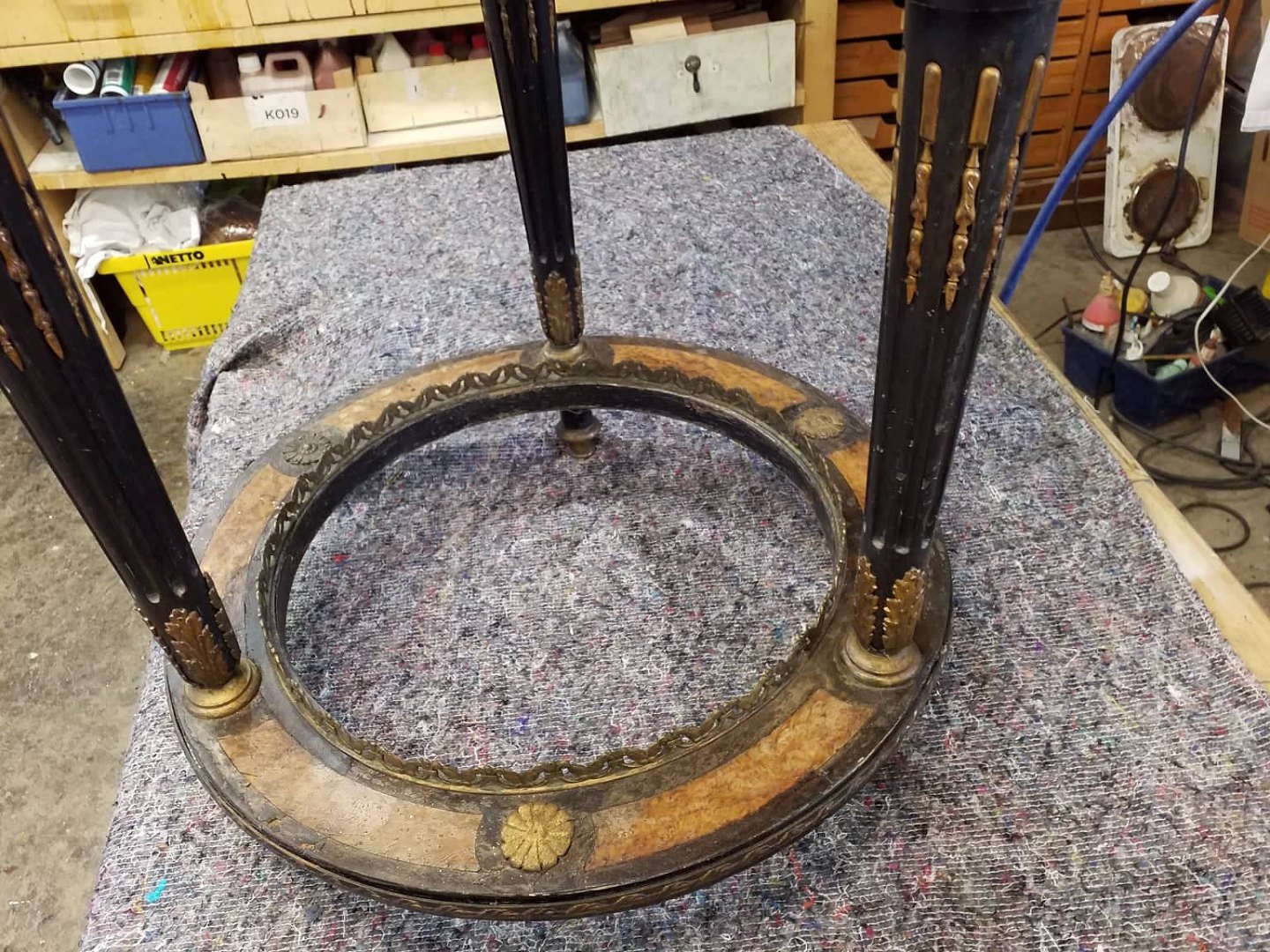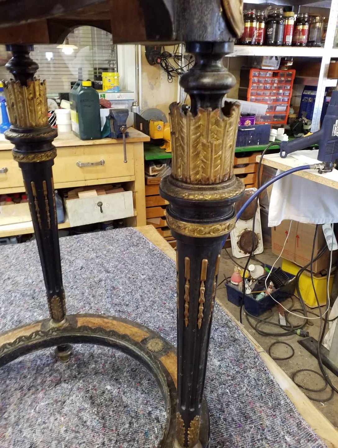 Here you can see a renovation of a French flower basin with bronze from around the 1820s with inertia, which means inlaid wood in different types of wood here including Walnut and black ebony.