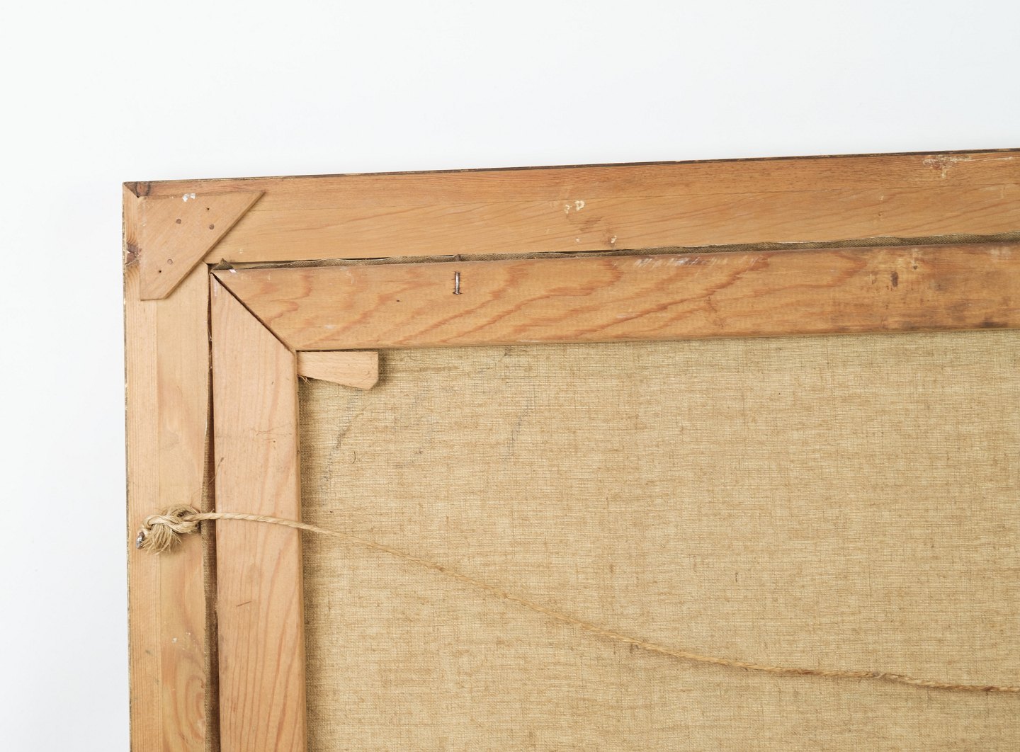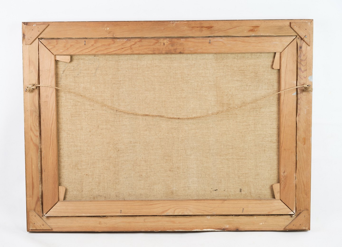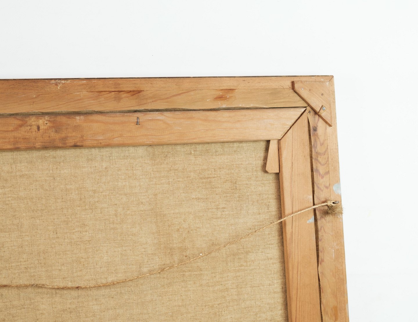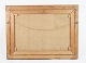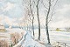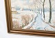 Oliemaleri på lærredet med motiv af natur med sne og bondehuse fra omkring år 1930'erne.