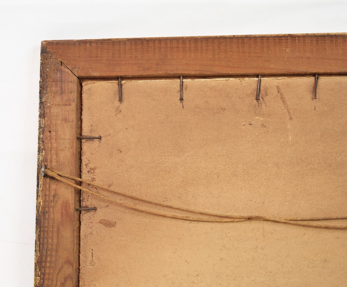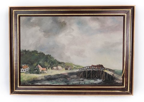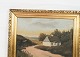 Oil painting of a small farmhouse and gravel road painted on wooden board with gold frame from around the 1940s. In very good used condition.