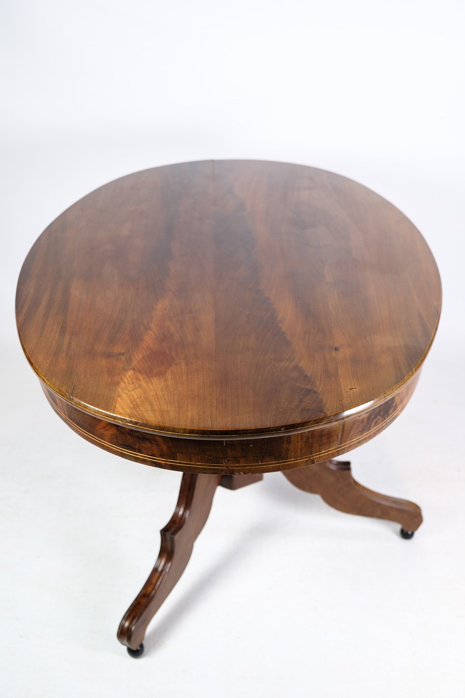 Dining table on a mahogany pillar with marquetry from the late Empire period from around the year 1840s
