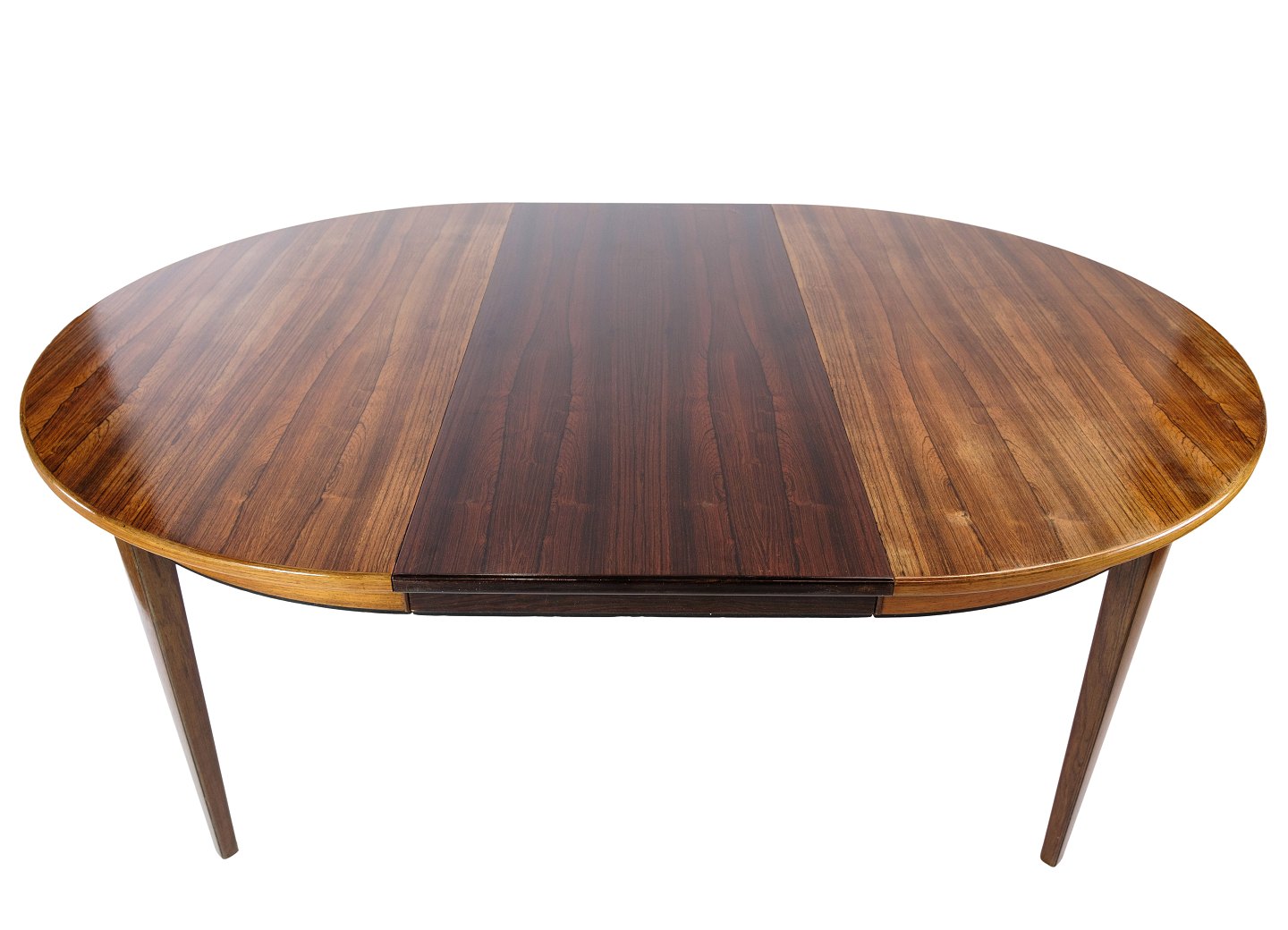 Dining table, designed by Omann Junior in rosewood from around the 1960s. If desired, we can color the additional plates the same color in our professional workshop.