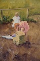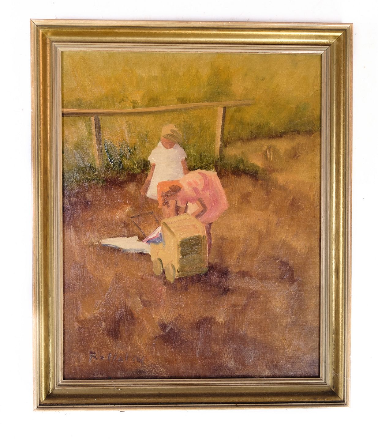 Oil painting on canvas with a motif of children in prams from around the 1940s. Painted by Daniel Bernhardt in The Road.