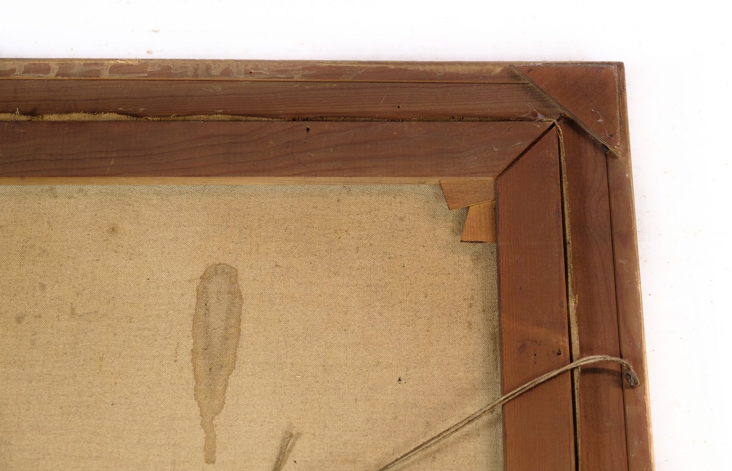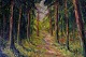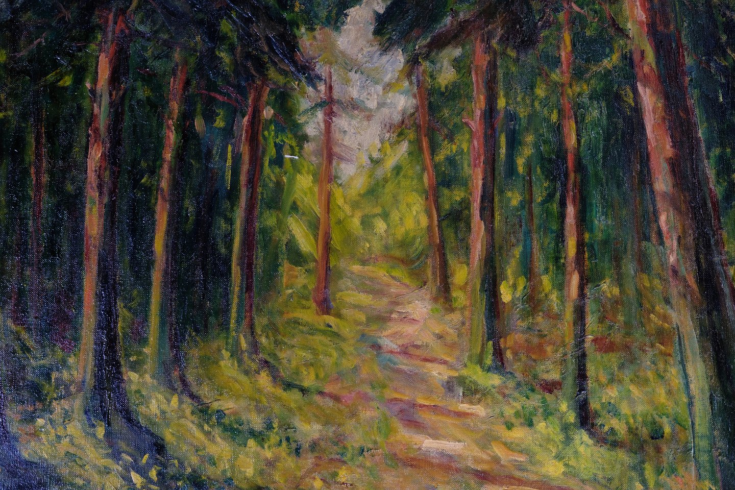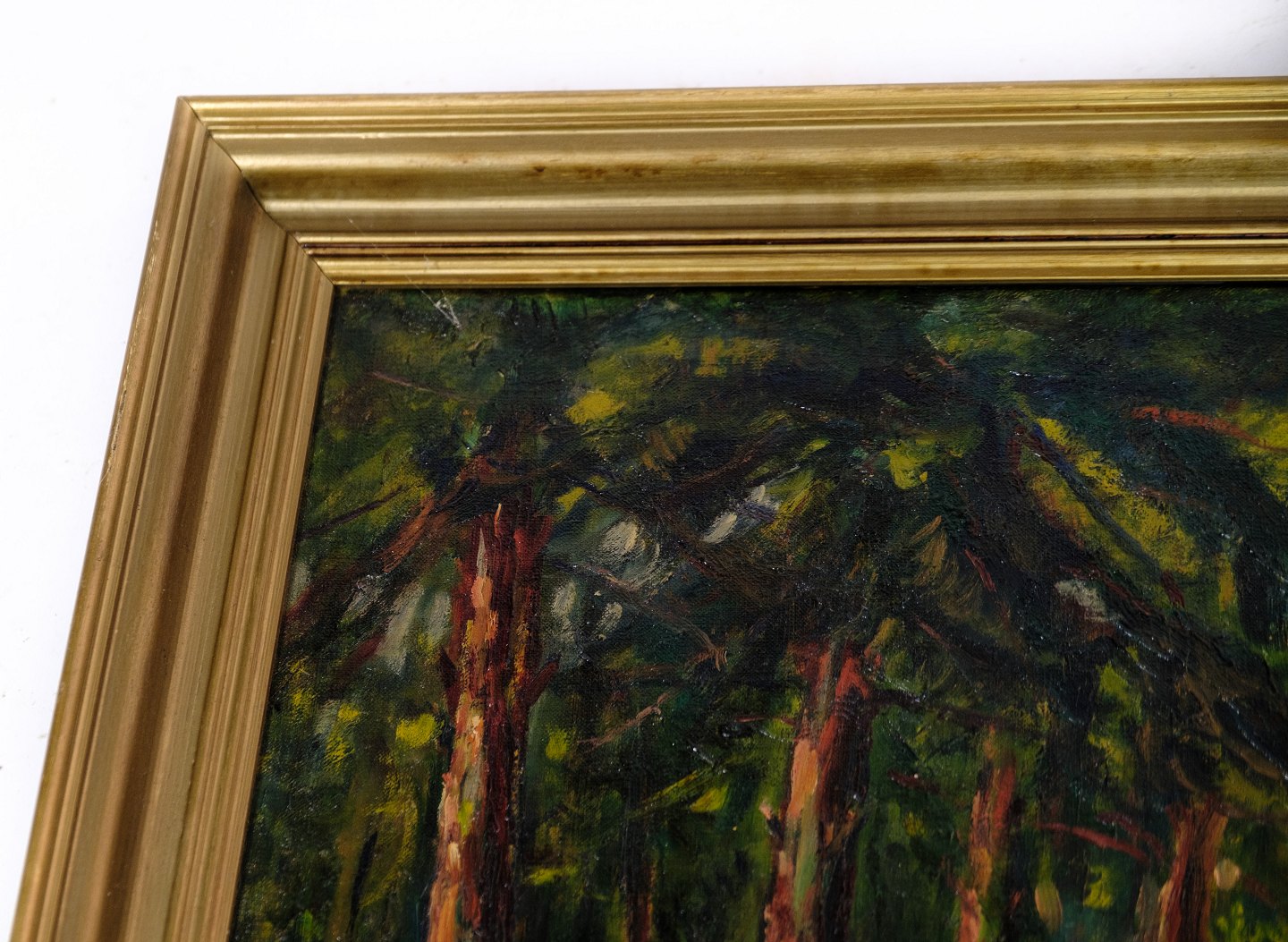 Oliemaleri på lærredet med motiv af skov malet af P. Janick fra omkring 1930'erne.