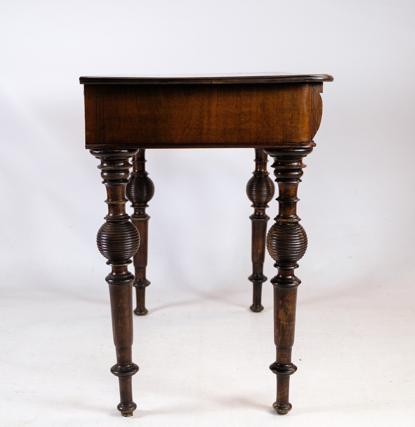 Skrivebordet er rig på detaljer, med delikate udskæringer og fine træmønstre, der fremhæver valnødtræets naturlige skønhed. De elegante ben og den forseglede overflade tilføjer både styrke og raffinement til møblet.