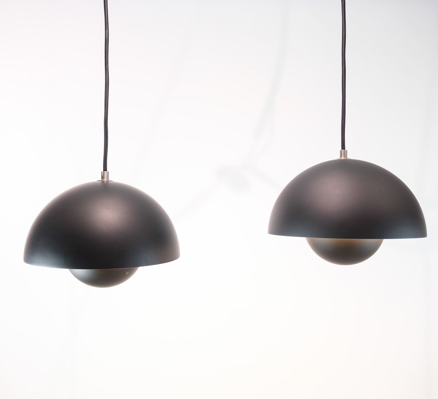 Set of 2 black ceiling lamps, model flowerpot VP1, designed by Verner Panton in 1968. They are both in incredibly good condition.