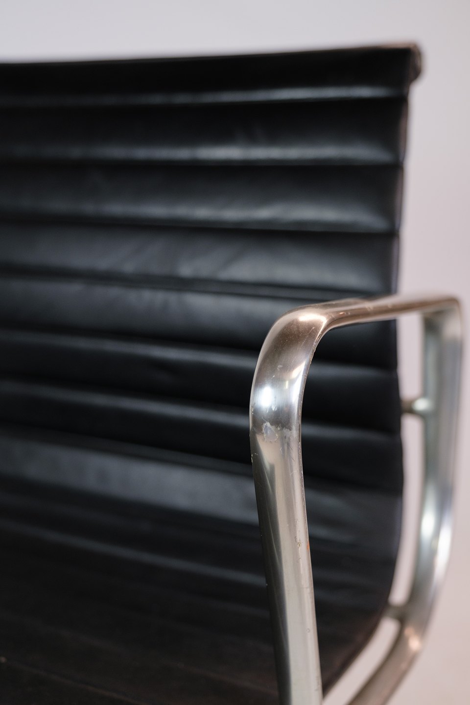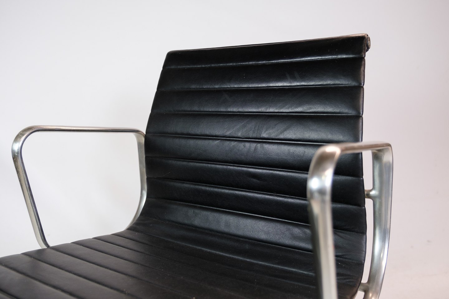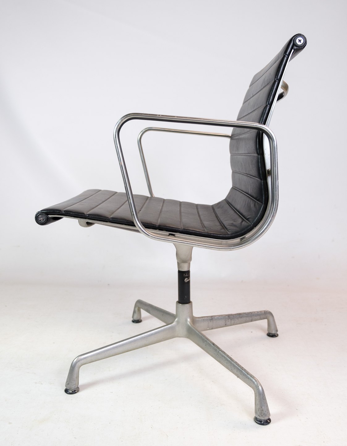 SolgtKontorstol / armstol, model Ea-108, designet af Charles Eames produceret af Vitra. Stolen har originalt sort læder og har patina, da det er en brugt stol. Stolen har en drejefunktion og originalt label. 4 på lager